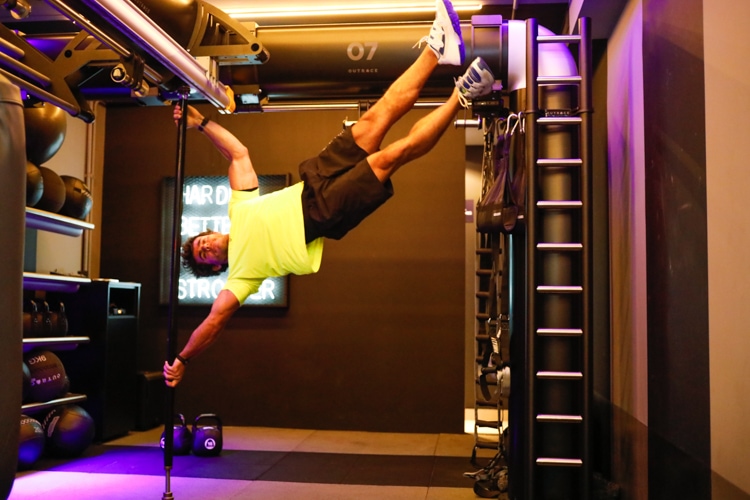 Les Cinq’s OUTRACE is an elegant Black-Black H-9 structure (four pillars and one single 9m long beam), which has been specially customized to perfectly fit the room on the third floor where it is located: a narrow and long space that has completely been revolutionized by OUTRACE, providing at the same time infinite training possibilities and a design that perfectly matches the club’s ambience.