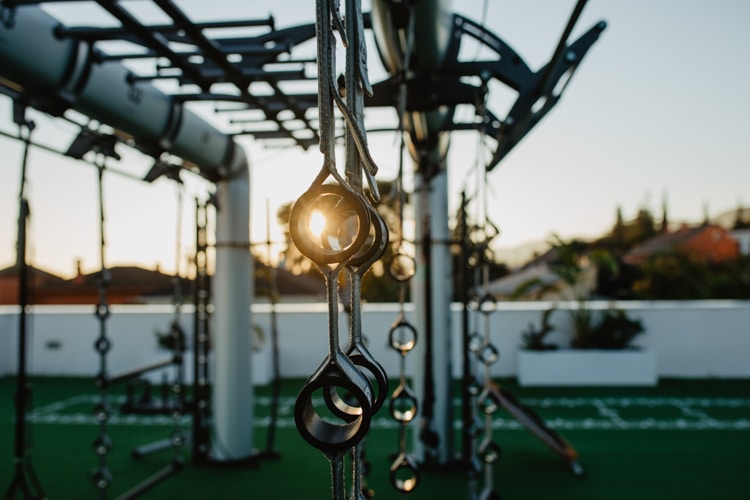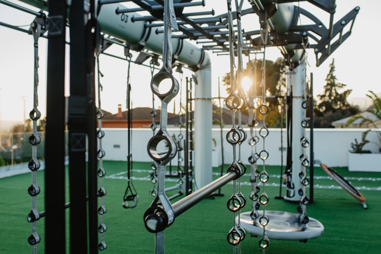 A particular mention should be dedicated to the outdoor functional training a calisthenics area: located in a suggestive terrace, it is completely covered in a technical synthetic grass flooring for a total area of around 1400m2. In addition, this space is equipped with three structures, including an 18m long Sidea Rack Station and, most of all, a wonderful OUTRACE structure.