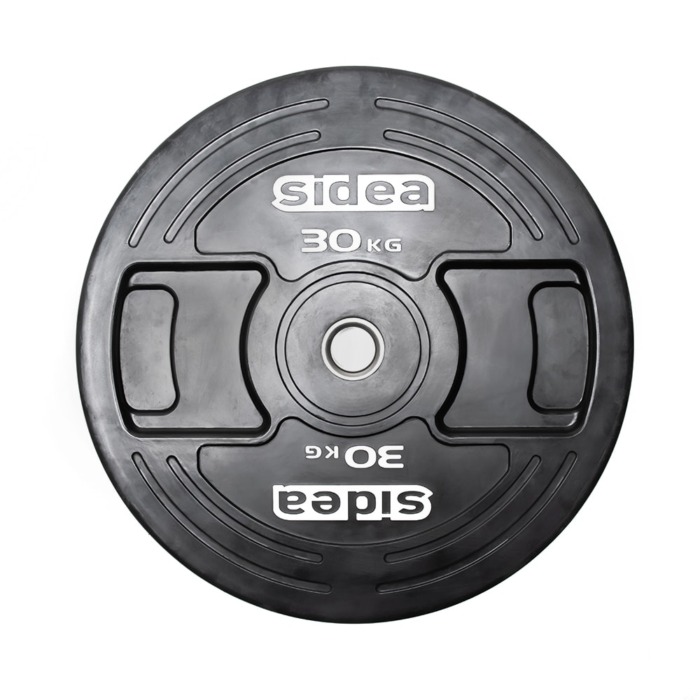 66 cm diameter disc, weight 30 kg, combining the construction characteristics of rubber bumper plates with the measurements of metal wagon wheels.