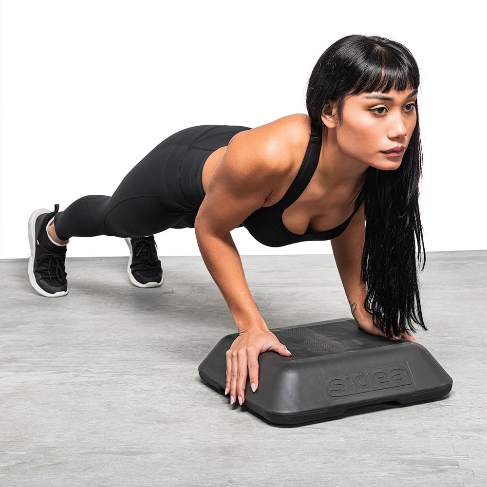 The advantages of the single platform of this new product do not stop here: using only the support base, without the steps, it is possible to obtain a rise of about 11cm, excellent for creating a deficit in all monopodalic exercises for the lower limbs such as lunges, or as an initial basis for pushups with raises and the like. In fact, higher steps (and therefore more marked deficits) are not suitable for a beginner or for people with limited mobility. Other applications of small deficits can be preparatory movements such as L-shaped pull-ups on rings, where it is necessary to place a progressively higher lift under the heels to then arrive at the final complete gesture with progressive difficulty.