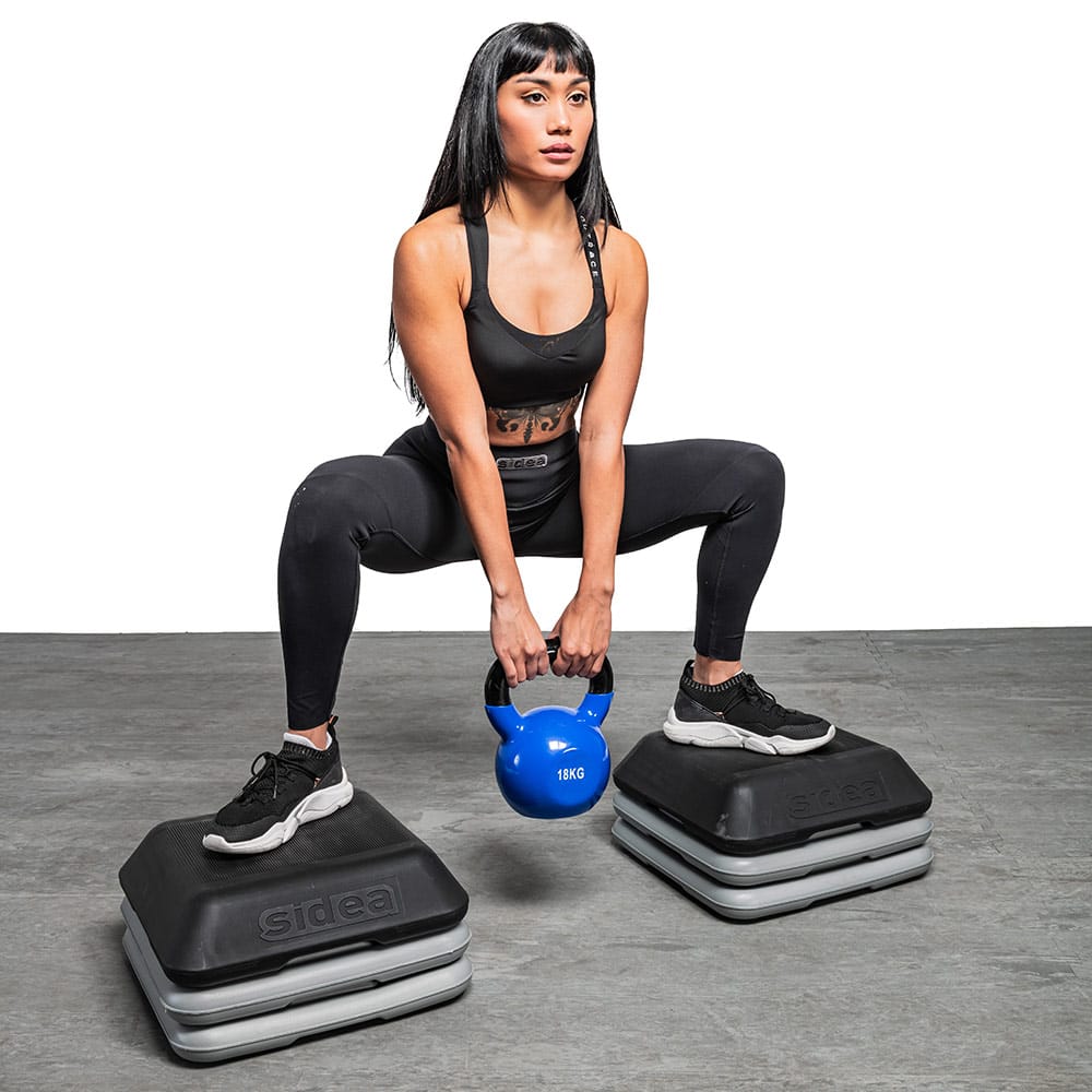 If bought in pairs, it allows to freely vary the distance and the position of the steps, and to take advantage of the central gap for exercises with a difference in the starting height between the feet and the tool (for example a sumo squat with a kettlebell).
