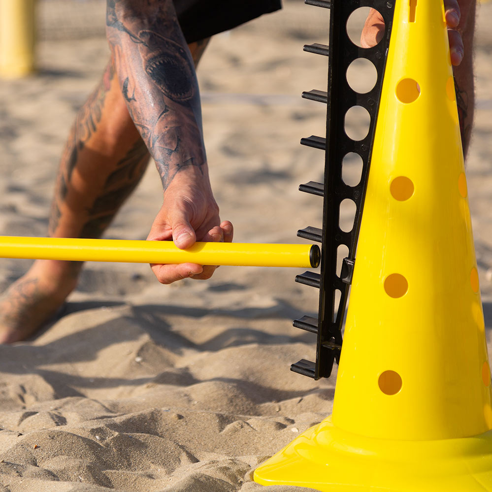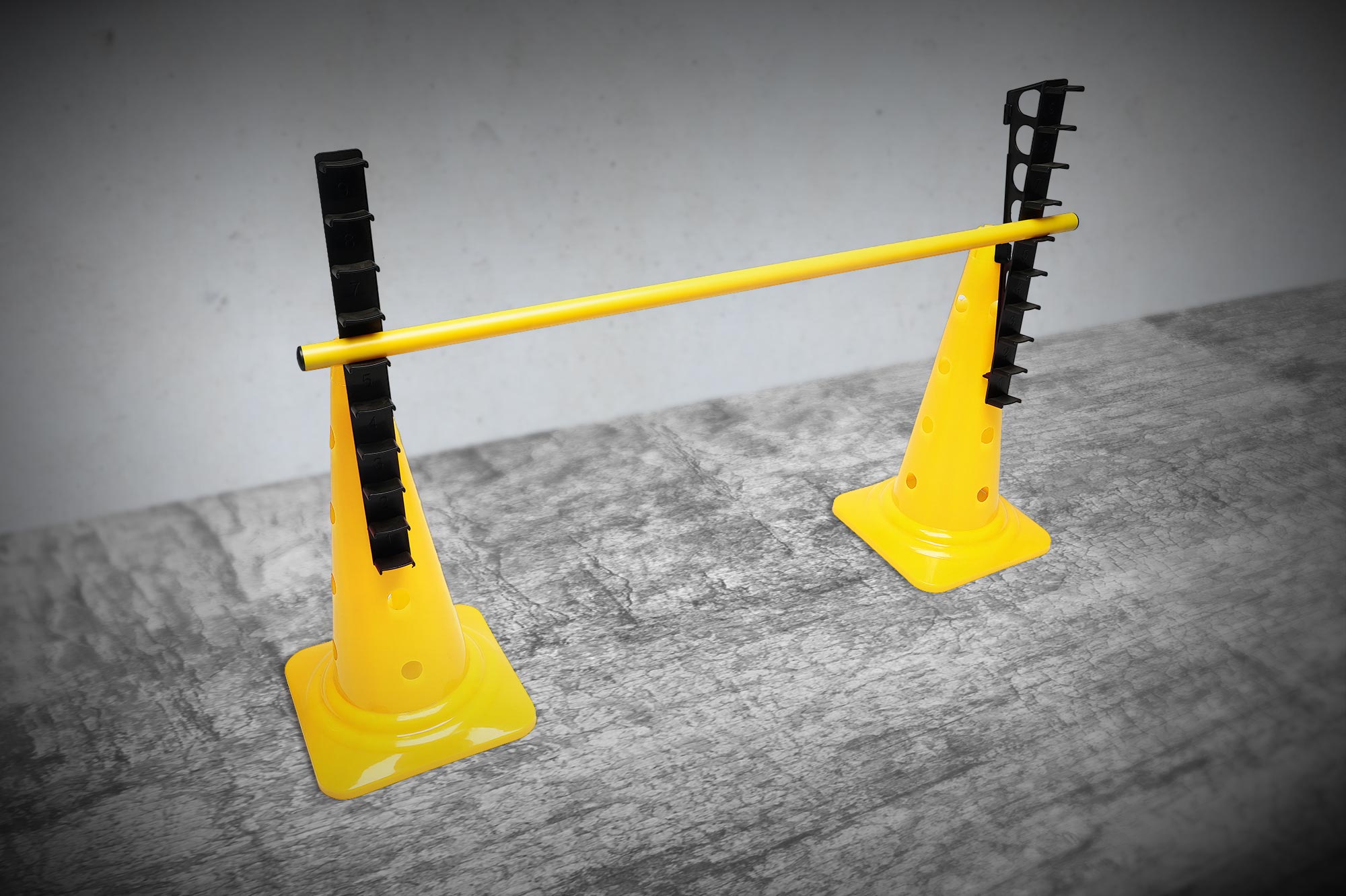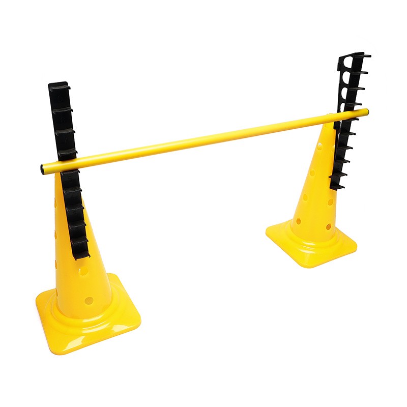 The Multi Hurdle Set consists of two cones with holes that allow the support of a hurdle bar base. The hurdle bar is adjustable at 10 different heights, from 40 to 85 cm, and it can be used for different types of conditioning exercises, to improve coordination through agility drills and leg speed workouts.