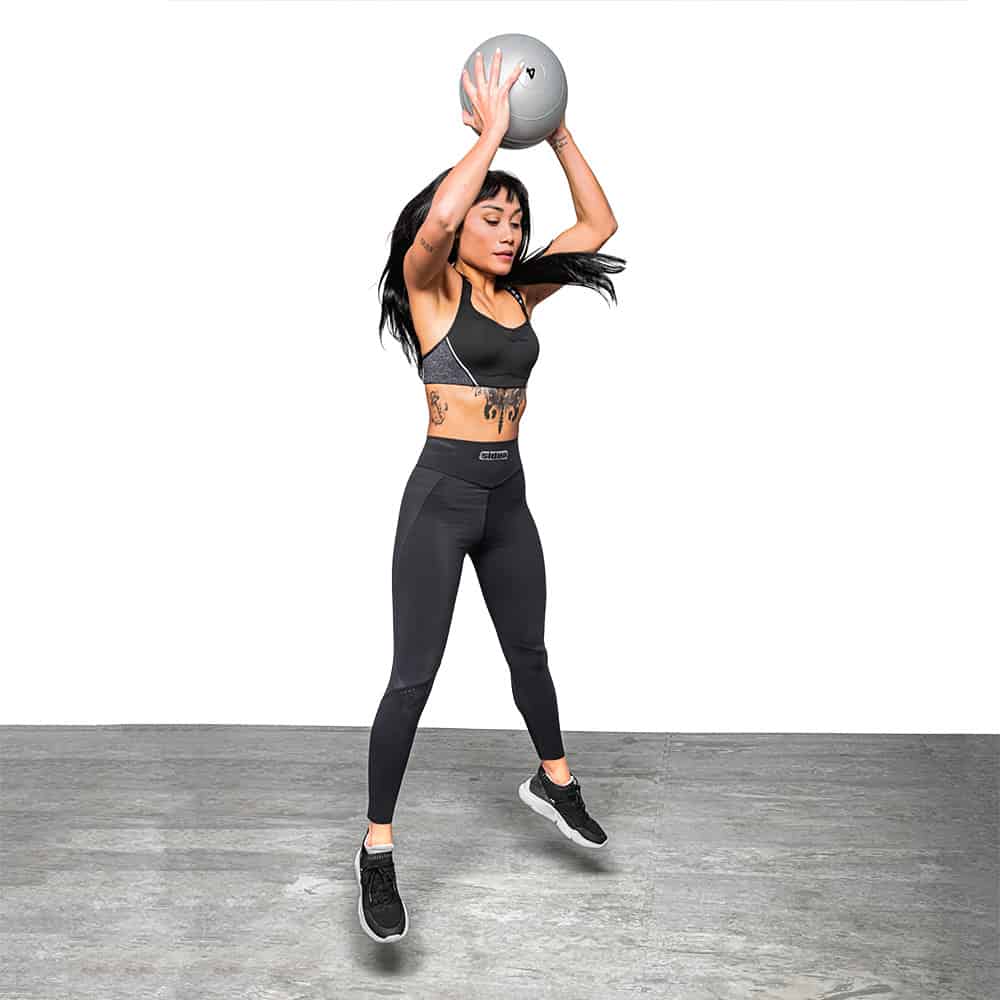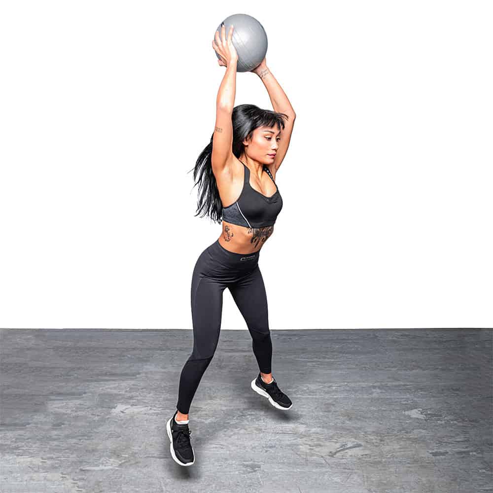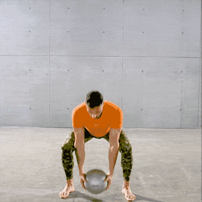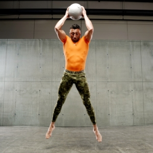 The initial phase consists of taking the medicine ball from the ground, bring it to the chest by performing a clean, with the elbows that must always be adherent to the hips. This is followed by a squat in maximum traction, taking care not to bring the elbows outside the knees, keeping the ball in line with the chest. From this position, the athlete has to let themself fall by rolling both forward and backward on the column, taking care of the squat return phase, not closing the knees, or moving the elbows away from the hips the strength of the abdomen. These movements allow the athlete to recover the antiversion of the pelvis immediately. The ascent phase from the squat is fast, powerful until performing a jump with the ball always on the chest. Once you reach the maximum phase of flight, arms at 90°, you have to bring the ball behind the nape of the neck, slamming it on the ground with force before landing. In this phase, the athlete must make the most of the abdomen’s explosive force and back. The correct direction of throwing the ball should be a little further forward than the body’s center of gravity. Finally, when the ball hits the floor, the athlete performs a new squat quickly, so fast that they take advantage of the medicine ball’s minimal rebound to catch it again.