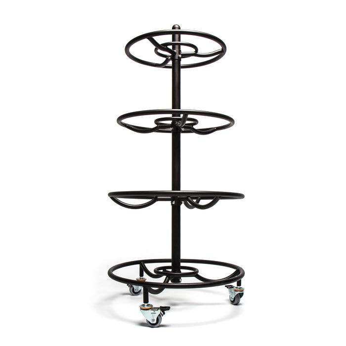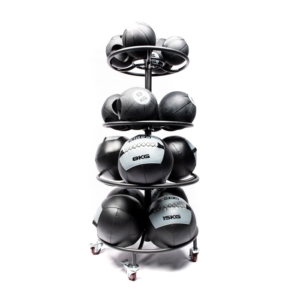 Circular rack, equipped with wheels. Stores up to 12 Giant Med Ball, diameter 36 cm, on three levels. The fourth upper level can store medicine balls of smaller diameter. Giant M-Ball rack helps you keep medicine balls organized, easily accessible, and off the floor. The casters allow easy transport from room to room without marking the floors. The rotating shelves facilitate quick access to the medicine balls from any angle. Perfect for both medicine and slam balls. Its vertical space-saving design makes it perfect for home gyms and studios.