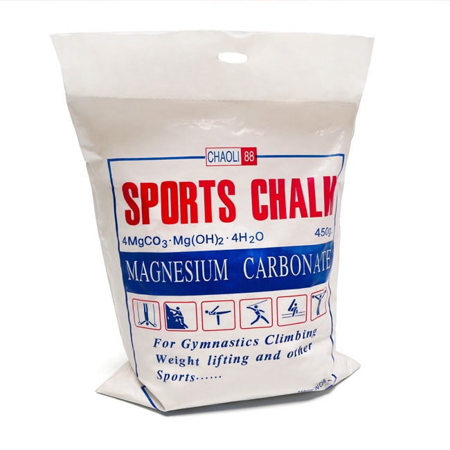 Powder Chalk – Magnesium carbonate. Commonly called magnesite, from the mineral from which it derives, the magnesium carbonate is mainly used on the hands to dry sweat and increase grip. The powder solution, not diluted in alcohol, is the most effective and affordable, especially if required for different parts of the body or on tools: hands, feet, neck, axillary areas, rings, bars, barbells.