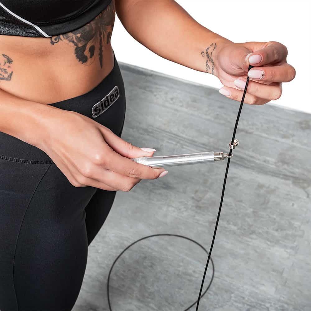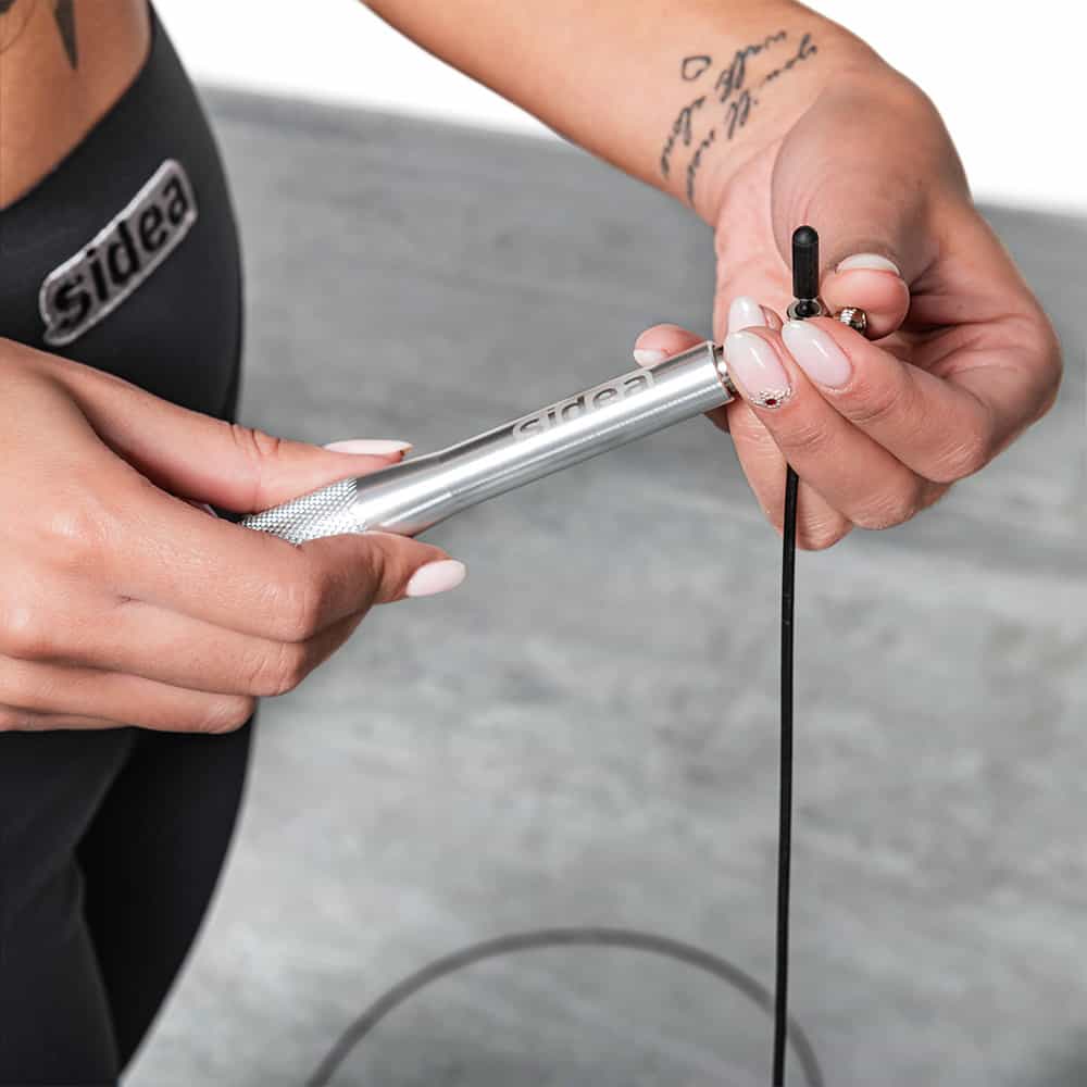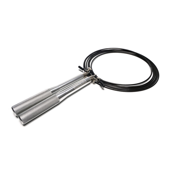 Footwork is essential in skipping rope workouts. This aerobic training improves coordination, proprioception, speed, and agility. The steel wire, with a length over 3 meters, can be easily shortened to meet the most suitable length. Usually, a 1.75 m tall athlete sets the rope at 2.30 m, excluding the handles. The knurled aluminum handles offer a secure hold and non-slip grip.