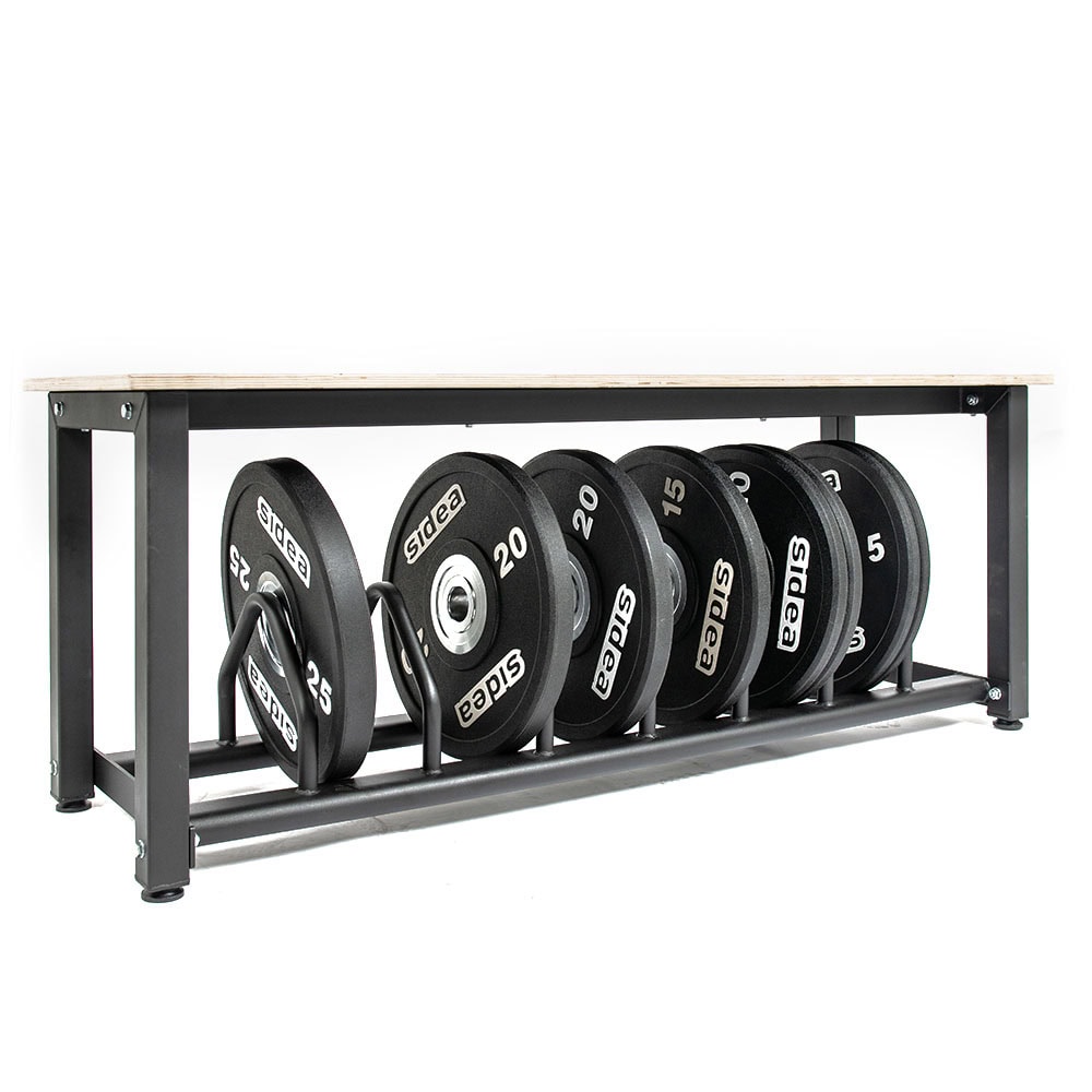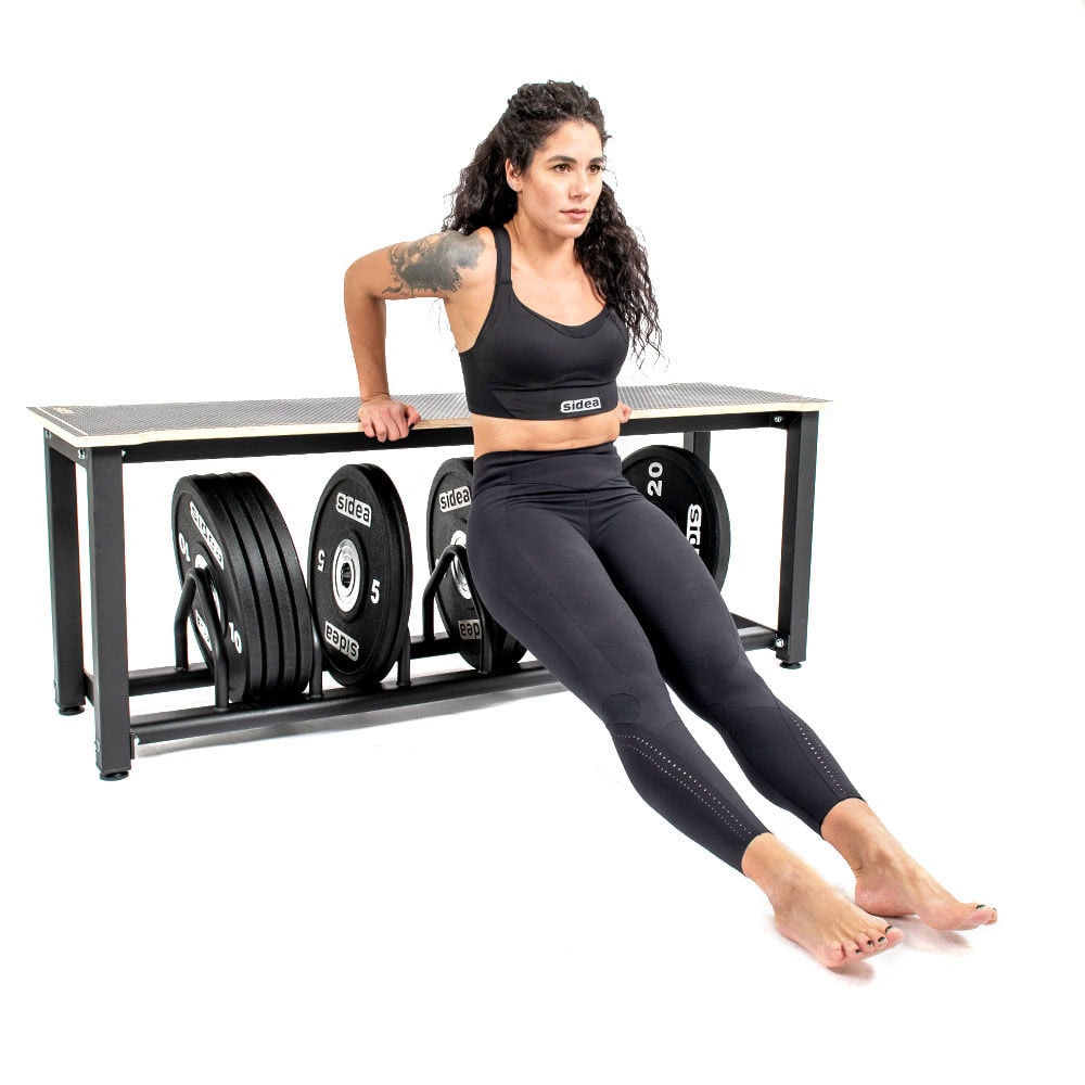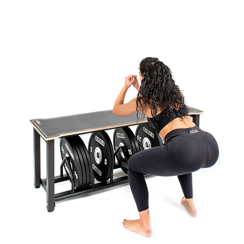 Designed in response to the needs of weightlifting gyms, this system optimizes space around platforms, transforming weight plate areas into a practical seat with a support shelf. Thanks to its sturdy metal frame, it is also ideal for plyobox training and fits perfectly into any Strength and Conditioning environment.