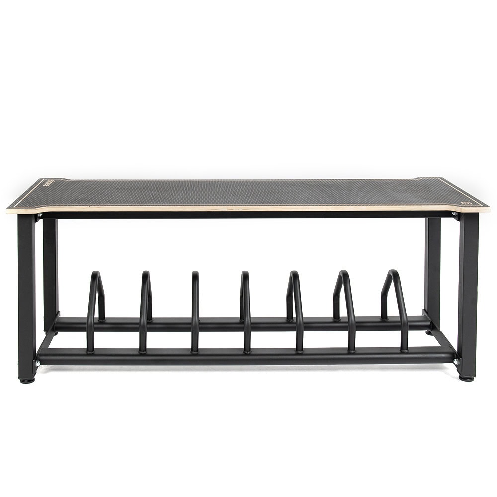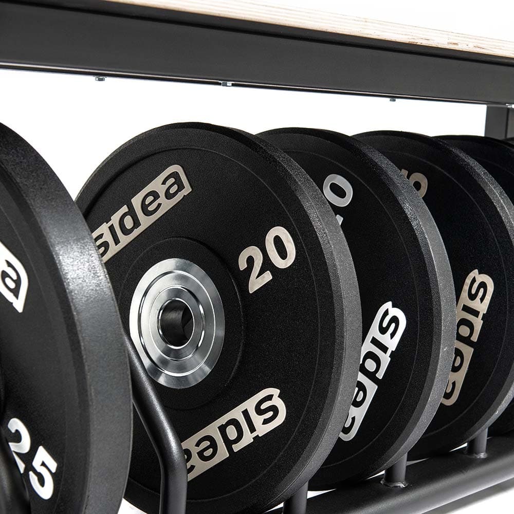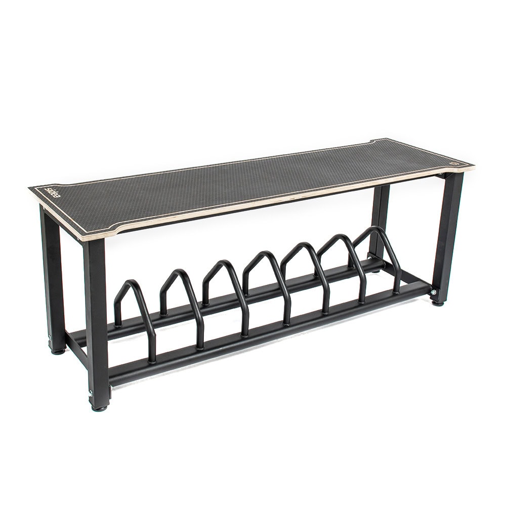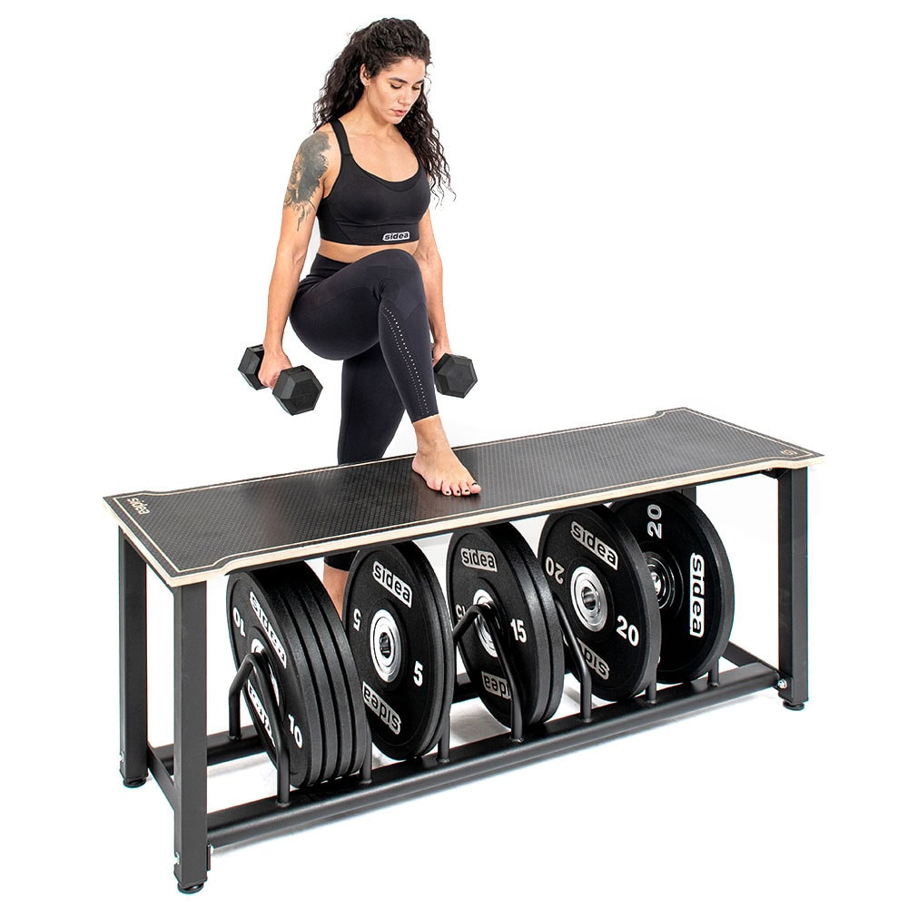 Designed in response to the needs of weightlifting gyms, this system optimizes space around platforms, transforming weight plate areas into a practical seat with a support shelf. Thanks to its sturdy metal frame, it is also ideal for plyobox training and fits perfectly into any Strength and Conditioning environment.