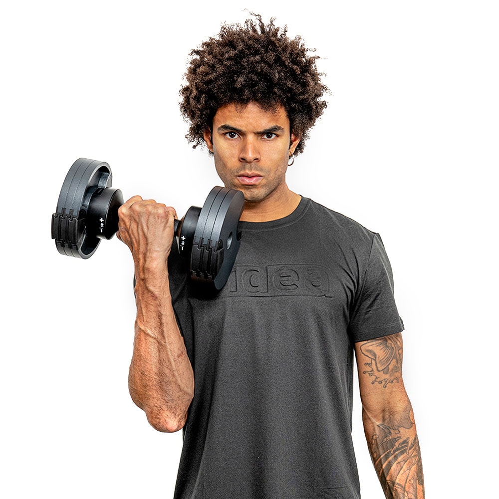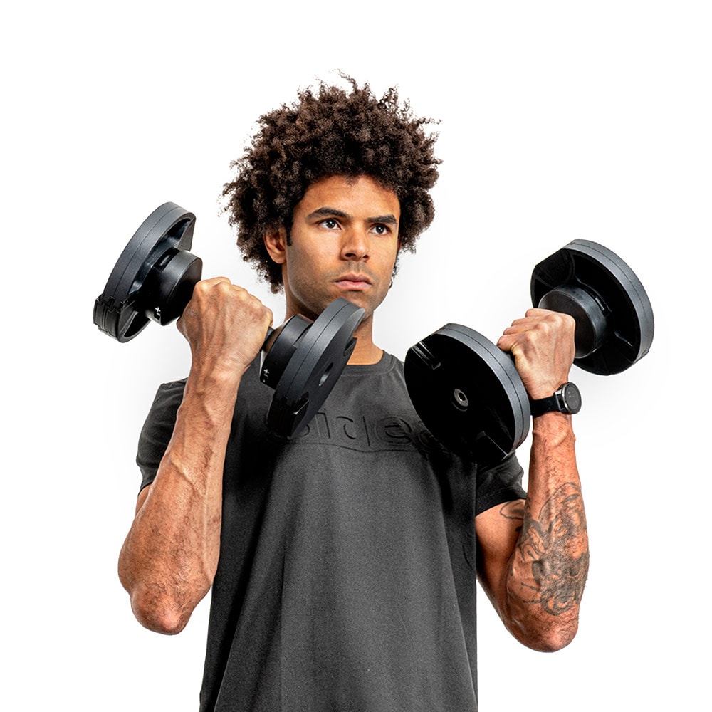 Identifies a set consisting of two dumbbells, 14 discs and two bases. The bases, dumbbell and disc holders, are necessary for the correct alignment of the set and the consequent operation of the selection system. Indeed rotation of the handle is only possible when the dumbbell is housed in the base, an action that allows movement of the selector shaft to engage the discs. The selection, displayed in the load indicators, is made through quick and precise shaft clicks, allowing the load to be modulated from 2 to 32 kg with 2 kg variations.