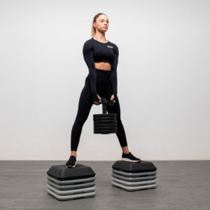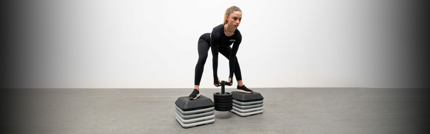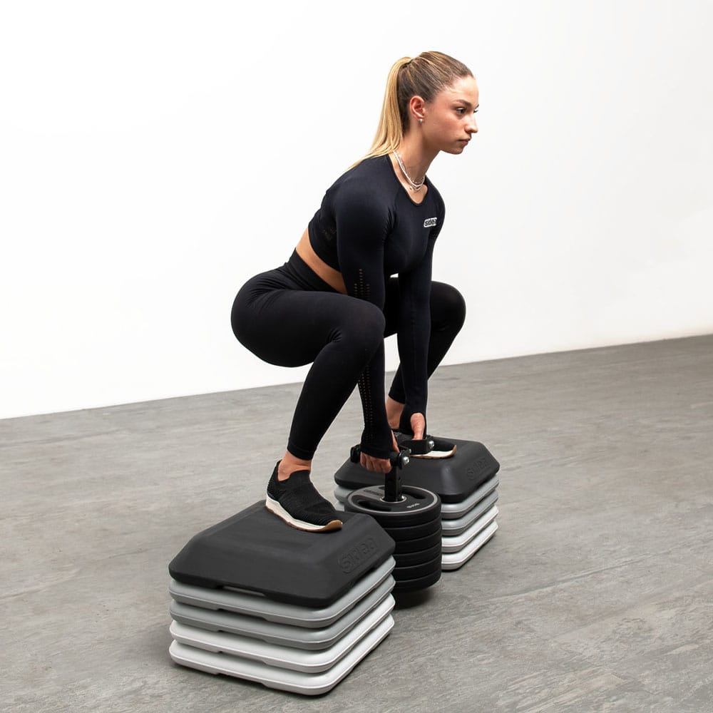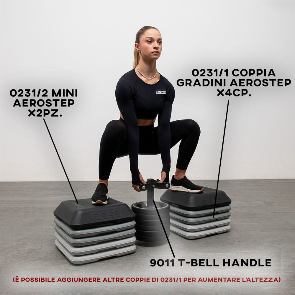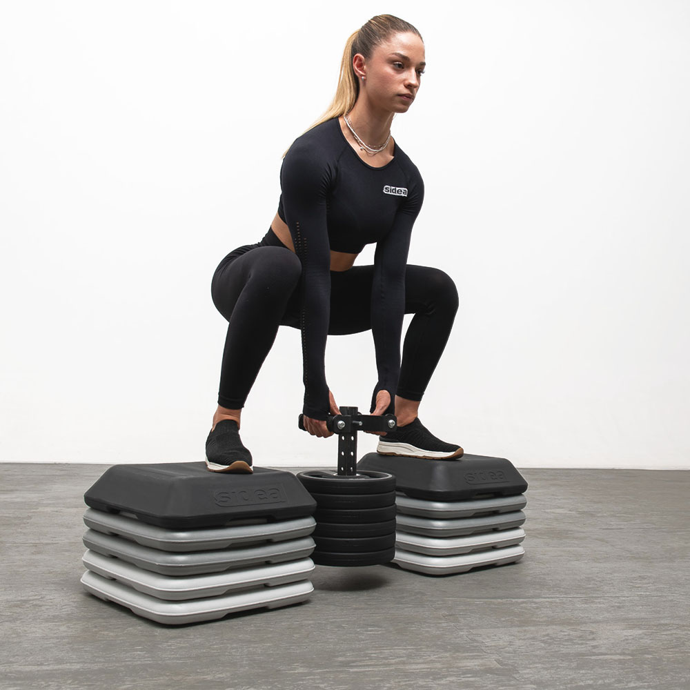 Designed for the Deficit Sumo Squat (Straddle Lifts) for gluteal training, it is actually a versatile narrow grip that can be used for several exercises; squats, side lunges and deadlifts in their different variations, Romanian Deadlifts above all, through to rowing and pulling exercises for the back and shoulders.