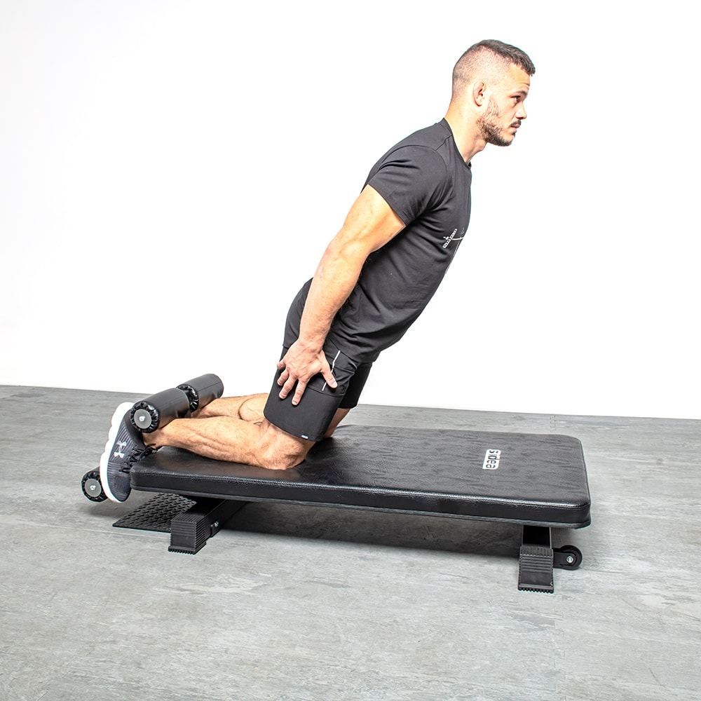 9123 Ghd & Sissy Squat – Hamstring Bench Two tools in one: Hamstring Bench and Sissy Squat. The Sissy Squat performed with a bench press is an exercise for training the quadriceps that reproduces the condition of retraction of the load that can be determined during skiing. Hamstring Bench (Nordic Norwegian Curl) is effective in training part of the posterior muscle chain (hamstring muscles, trunk muscles) mainly through eccentric (load slowing) and isometric (load arrest) yielding exercises. The 9123 bench, combined with the fundamental deadlift exercise, makes it practical to train all types of muscle contraction (isometric, concentric, eccentric) and therefore all the components of force production.