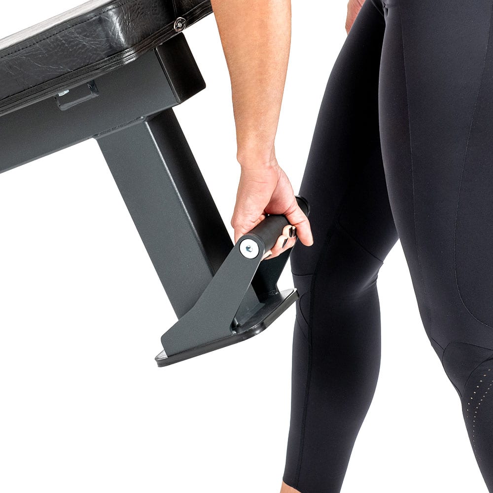 The solid front post allows for ample foot placement freedom, while the reduced cushion height (43 cm) promotes a stable heel position. The 43 cm height ensures optimal foot placement and drive on the floor, maximum stabilization of the body on the backrest, and allows for the natural lumbar arch, which enhances lumbar contraction, chest elevation, and shoulder adduction.