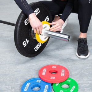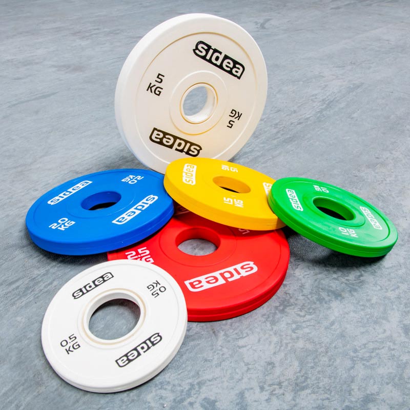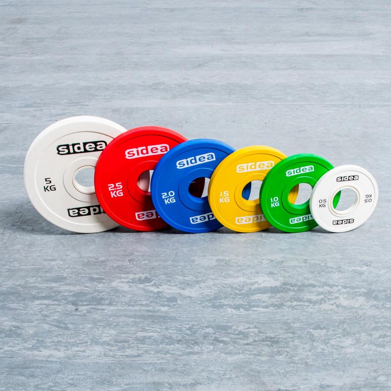 Series consisting of 6 rubberized plates. Internal opening diameter 50 mm. Color-coding according to IWF regulations. This set allows the splitting of the loadable weight.