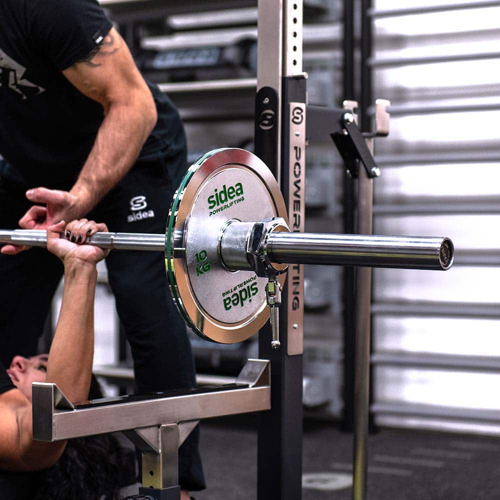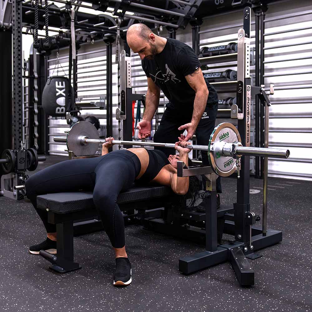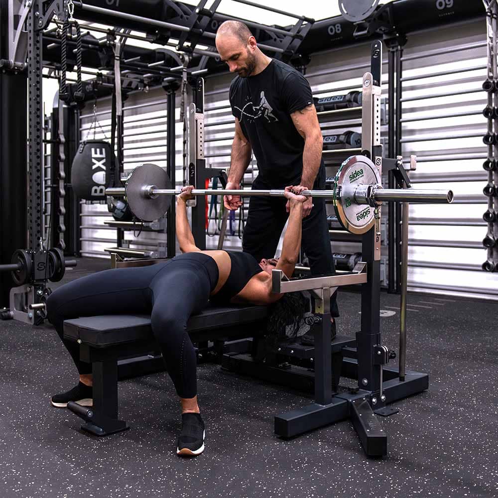 The 53 cm long safety spotters are made of stainless steel and finished with a plastic covering, featuring angled ends. They are adjustable and easy to remove for those who prefer a completely open rack.