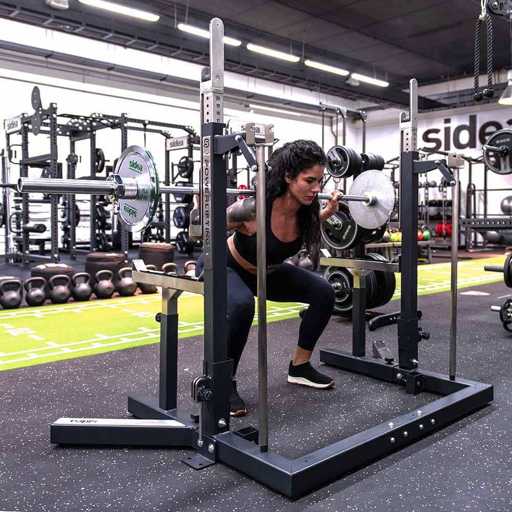 The barbell support lifting system is precise, allowing for quick and safe adjustments, even with heavy loads. The column tilt mechanism is also effective and simple, allowing for an inward tilt of up to 5°, making it easier to unrack the barbell during squats and providing a wider grip for taller athletes.