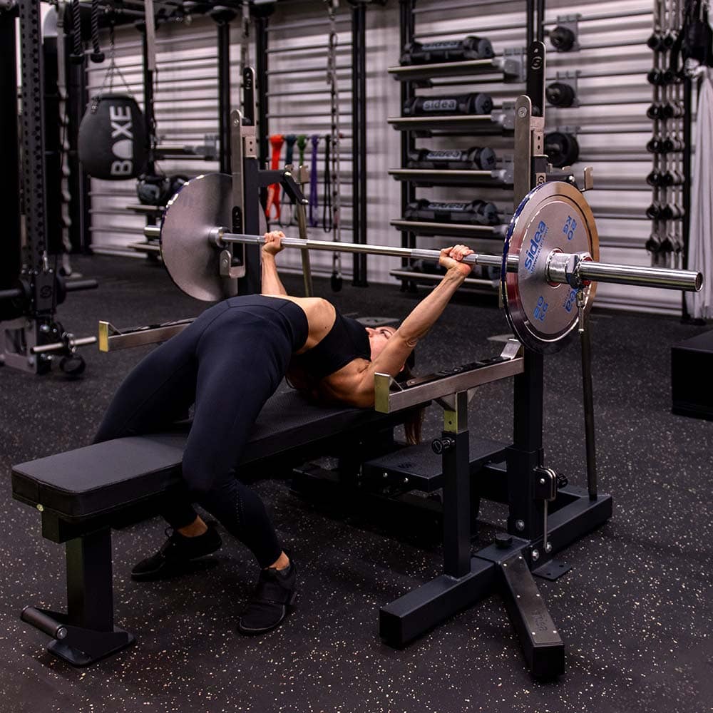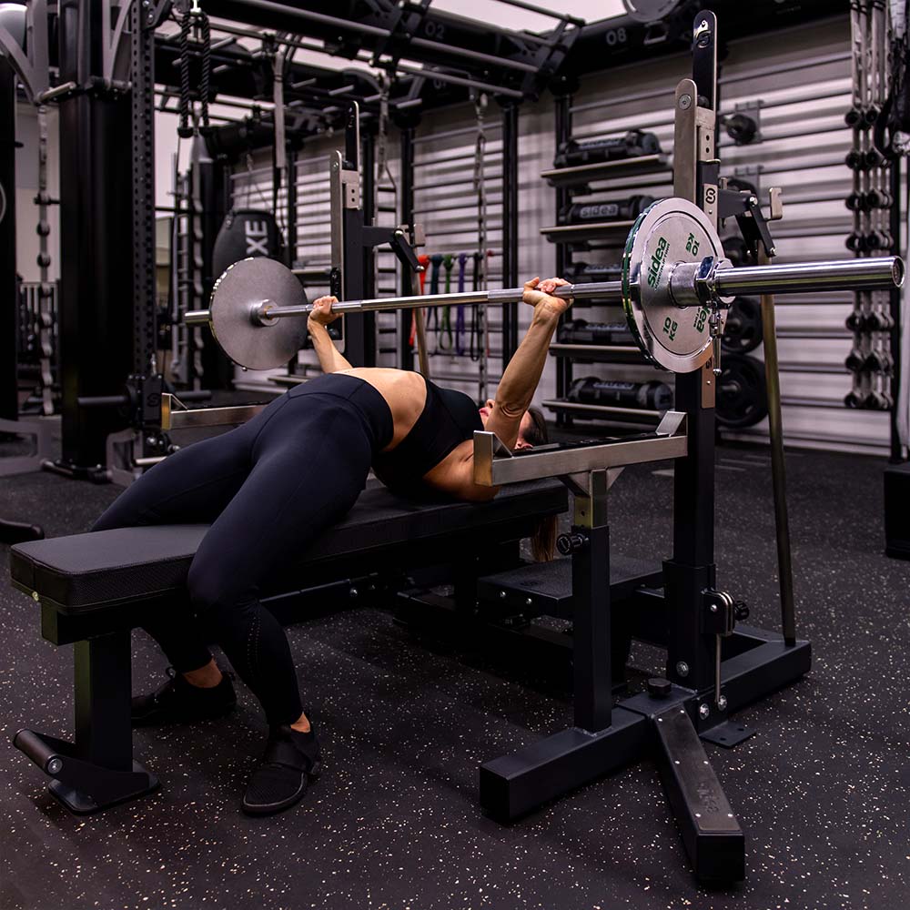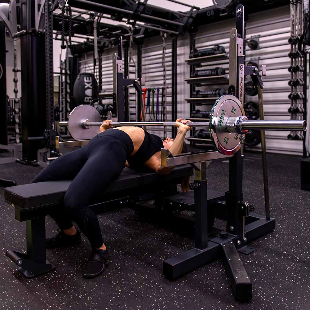 - J-hooks with rollers for easier barbell centering.