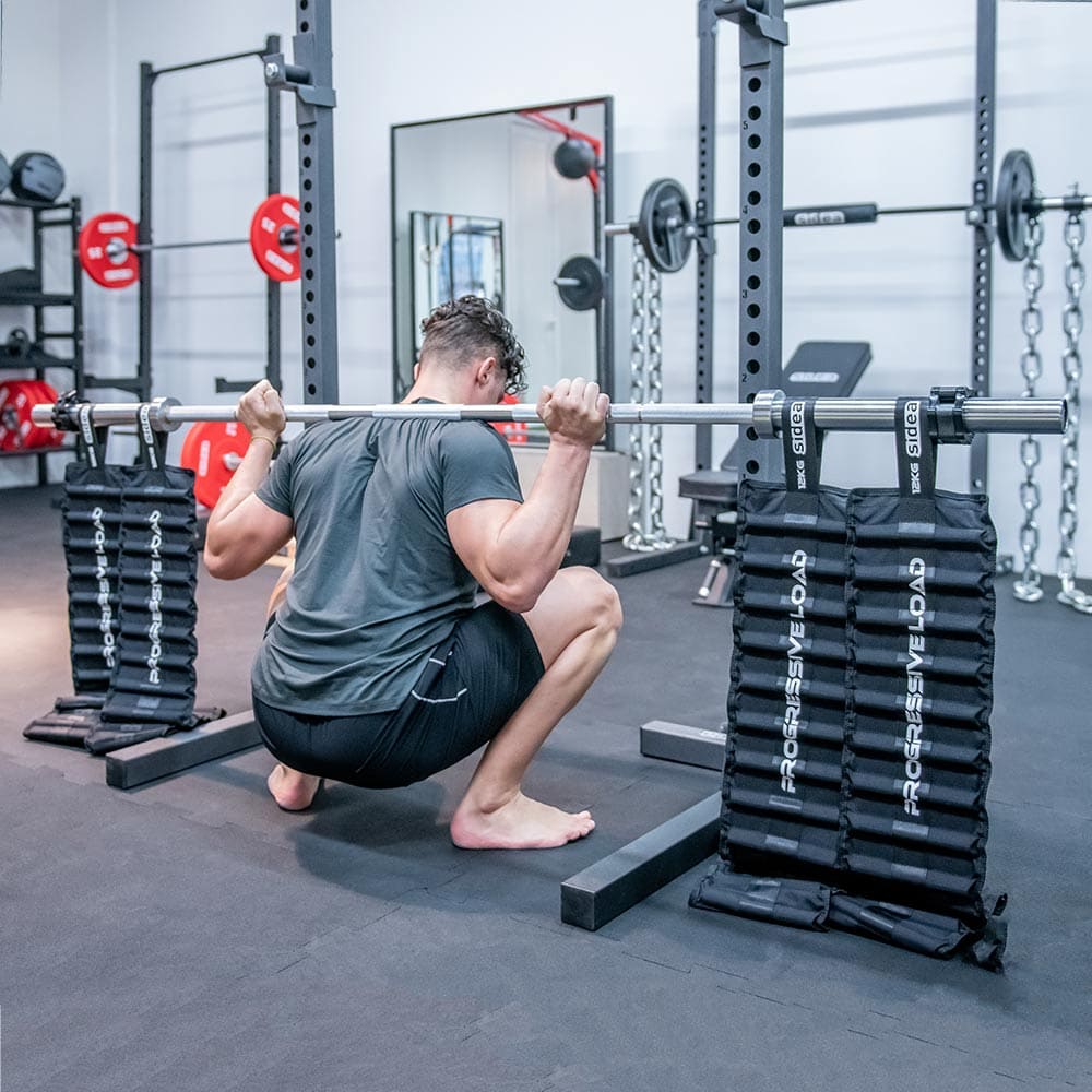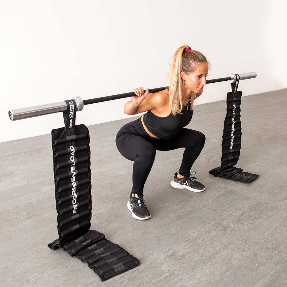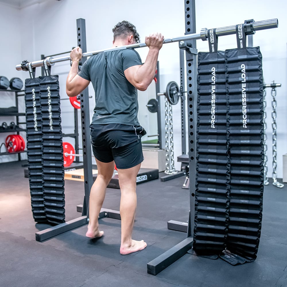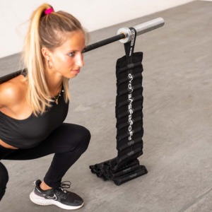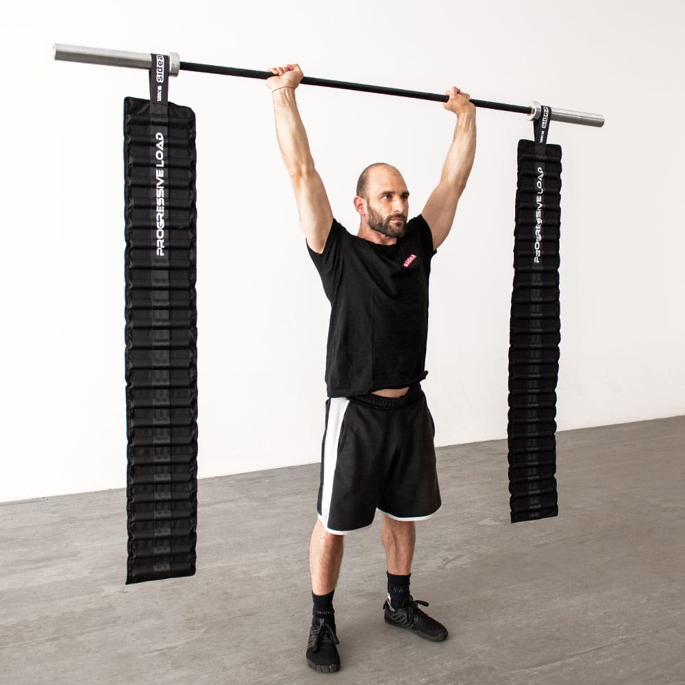 Several pairs of chains can be mounted on the barbell to increase the weight of the progressive overload.