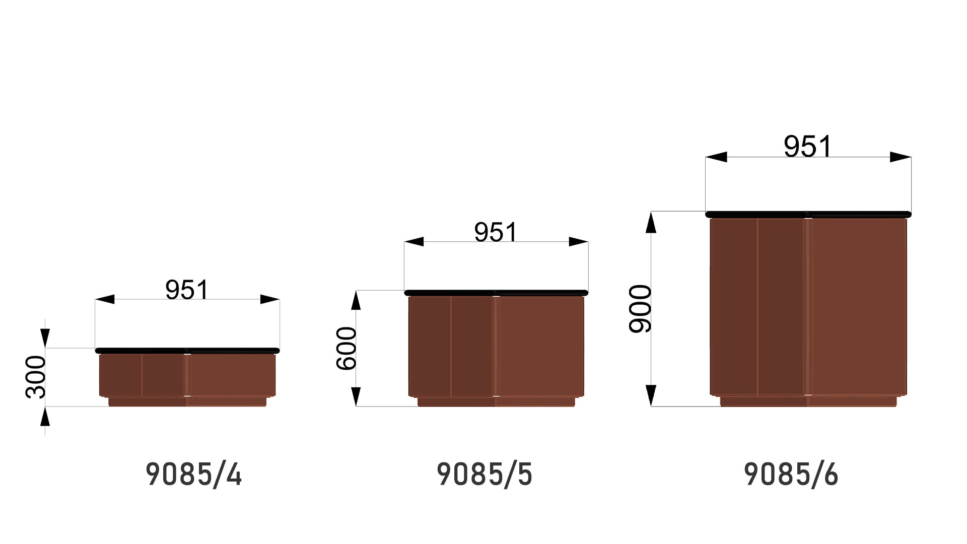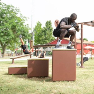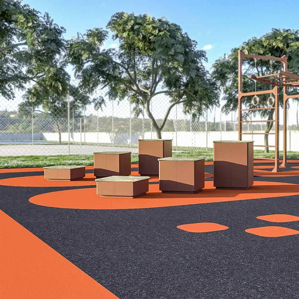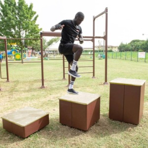 The Public Island Plyoboxes codes 9085/4-/5-/6 are a Public Island Rack accessory, designed to provide outdoor training solutions in public areas, such as parks, gardens and beaches. They are three boxes directly fixed to the ground in an indipendent way from the main structure of the Public Island, designed to perform plyometric exercises or as raised supports for bodyweight exercises. The Plyoboxes, which can be purchased individually, are available in three different heights, namely 30, 60 and 90 cm, and have a square base of 69×69 cm. The main part of the box is realized in a treated metal for outdoor installation, while the upper part is made of treated wood for outdoor use.