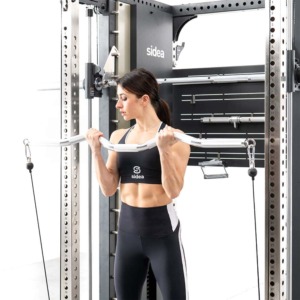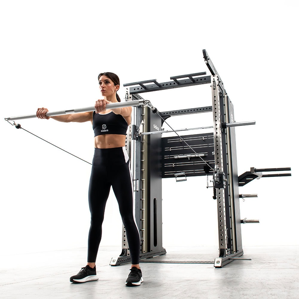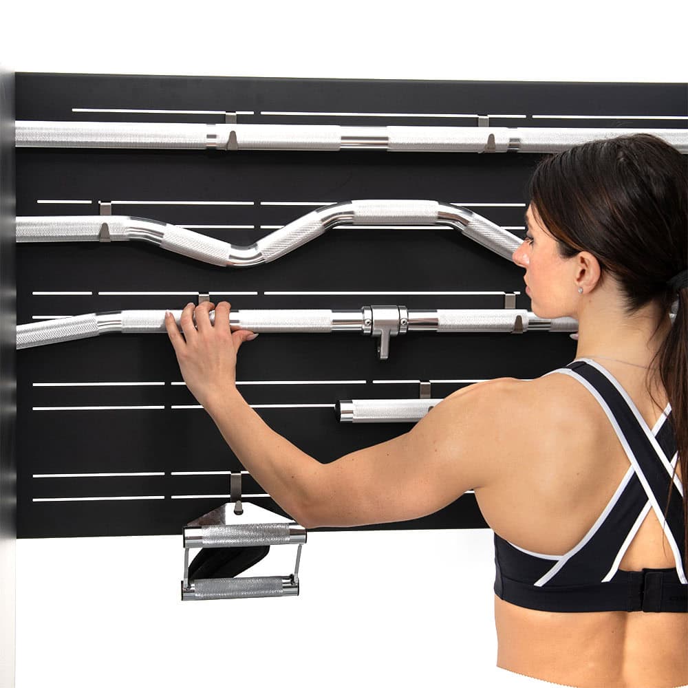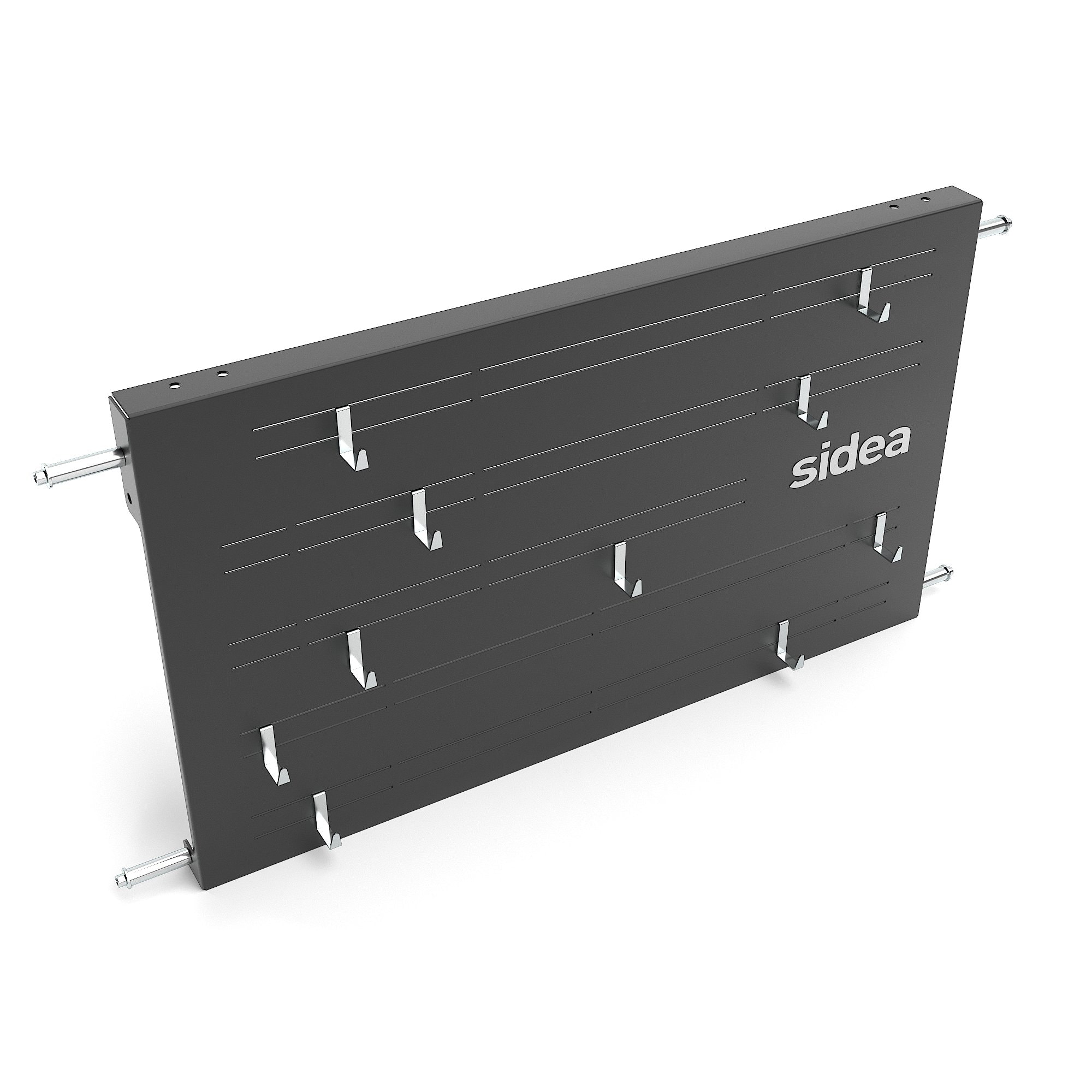 This optional component is designed to be installed between the two rear uprights of the rack. It consists of a slotted metal panel with horizontal slots that allow positioning of the 10 S-hooks, ideal for neatly displaying and hanging bars, handles, and other accessories.