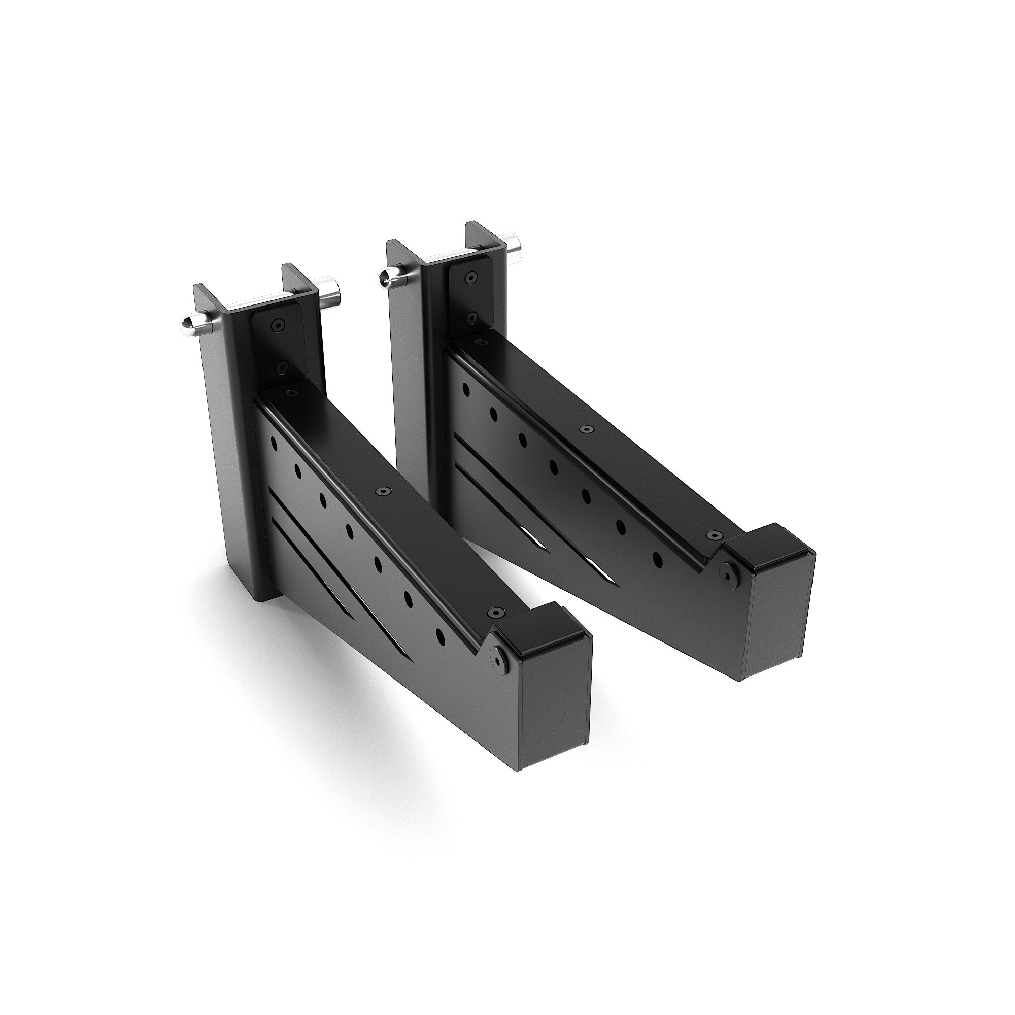 Pair of powder-coated steel safety arms, designed as an optional component for the 9088 All-In-One Premium Rack. Extremely sturdy and reliable, they feature 3 mm steel reinforcement plates and high-resistance polymer contact surfaces to protect both barbell and rack. Their high mechanical strength allows them to pass EN ISO 20957 standard tests.