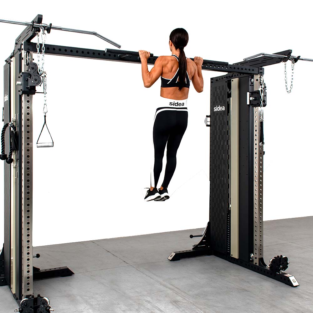 The connection bar, made of 75 × 75 mm steel tubing, finished with paint, has a modular perforation that allows the 9088/1 All-in-One Rack Premium Pull-Up Bars to be mounted.