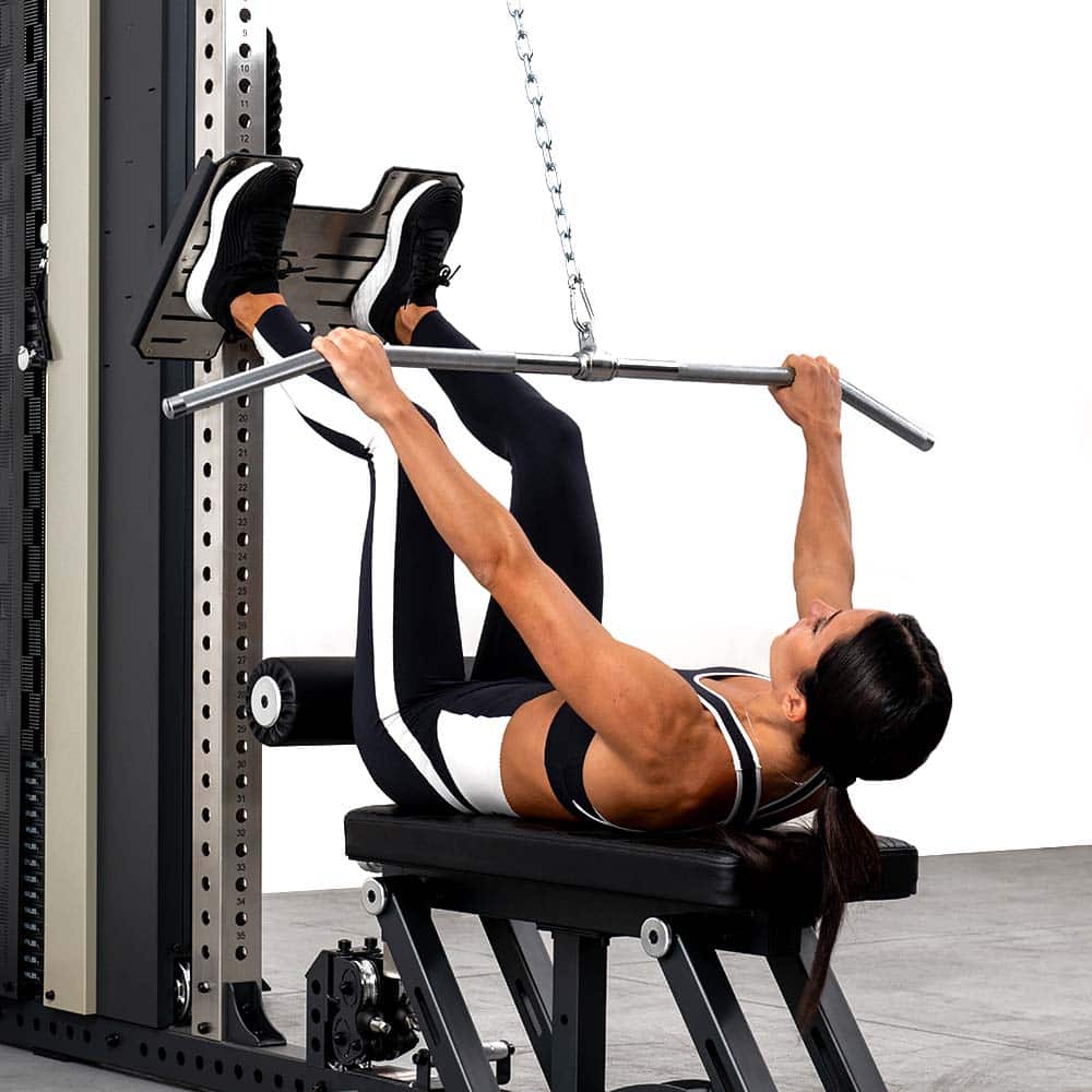 It quickly connects to the stainless steel front post of the Weight Stack Unit 9089A, providing effective support in cable pulling exercises, thanks to the integrated leg rollers that ensure stability and control during execution.