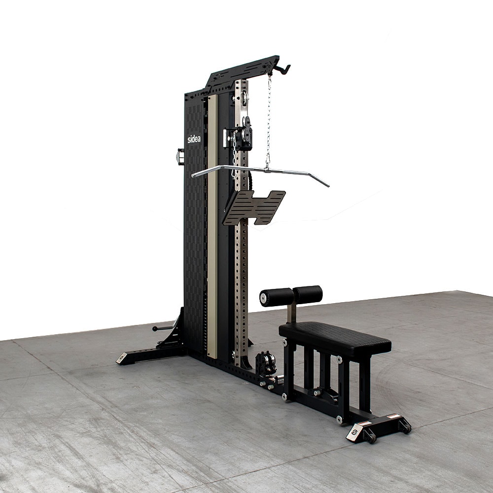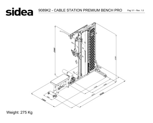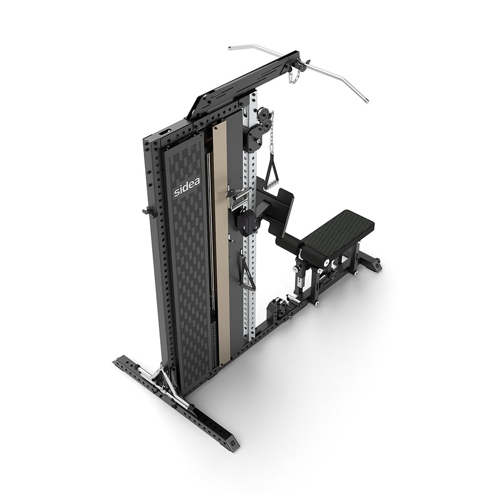 The core module of the Cable Station Premium modular solution is 9089A, which forms the basic structure of the system. 9089A consists of two 75 x 75 mm uprights, a 90 kg weight pack and protective covers. The front upright, made of stainless steel with a natural finish (no paintwork subject to wear), integrates the quick height adjustment system of the aluminium pulley of the Adjustable Pulley cable. The cable, which can be extended all the way to the ground, is rubberized and multi-directional thanks to a pivot system that ensures smooth and silent movement. The 2:1 transmission ratio allows a smooth and precise movement of the weight stack. Load selection is via the classic pivot system, connected to a retaining spring that prevents accidental loss of the selector. The 9089A also features a Lat Machine cable, transmission ratio 1:1, and a Dual Low Pulley, i.e. two independent low pulleys that can be used separately, transmission ratio 2:1, or simultaneously, transmission ratio 1:1. This configuration offers greater freedom of movement, allowing for independent bilateral or unilateral exercises, and more natural biomechanics, as each limb can move along its own traction plane.