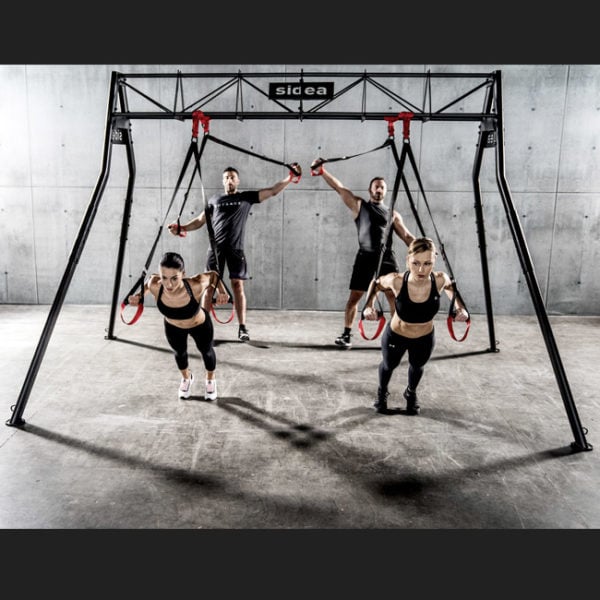 Assembly is quick, no specialized personnel are needed, and there is no need (however, it is recommended) to attach the uprights to the ground. The truss is also suitable for bar traction exercises and also for this reason can be placed inside a traditional isotonic equipment room.The solution is also particularly suitable for organizing mini Flying classes or for completing training circuits within gyms dedicated to athletic preparation or personal training. At the bottom of each upright there is a welded half-ring, useful as an attachment for carabiners, ropes and elastics.