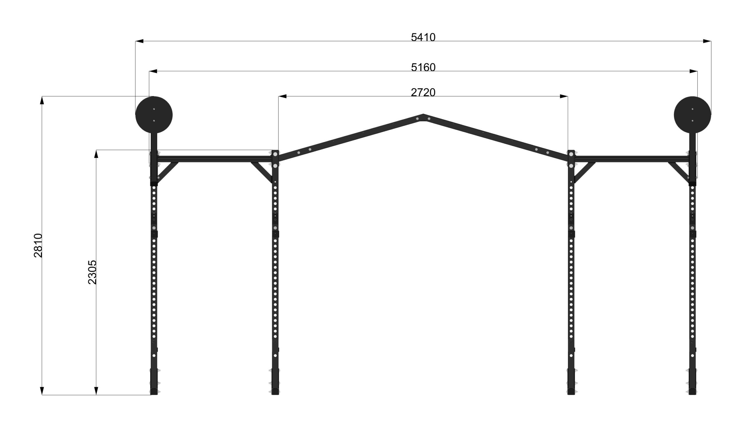 In addition to the 7 pegs with a diameter of 38 mm and spaced 30 cm apart, the D. Ladder is also equipped with two parallel tubes placed underneath the ladder, which allows the support of suspended accessories such as Flying or elastic bands, also giving a greater number of positions for the execution of pull-ups (in addition to the two included in each Power Cage Rack).