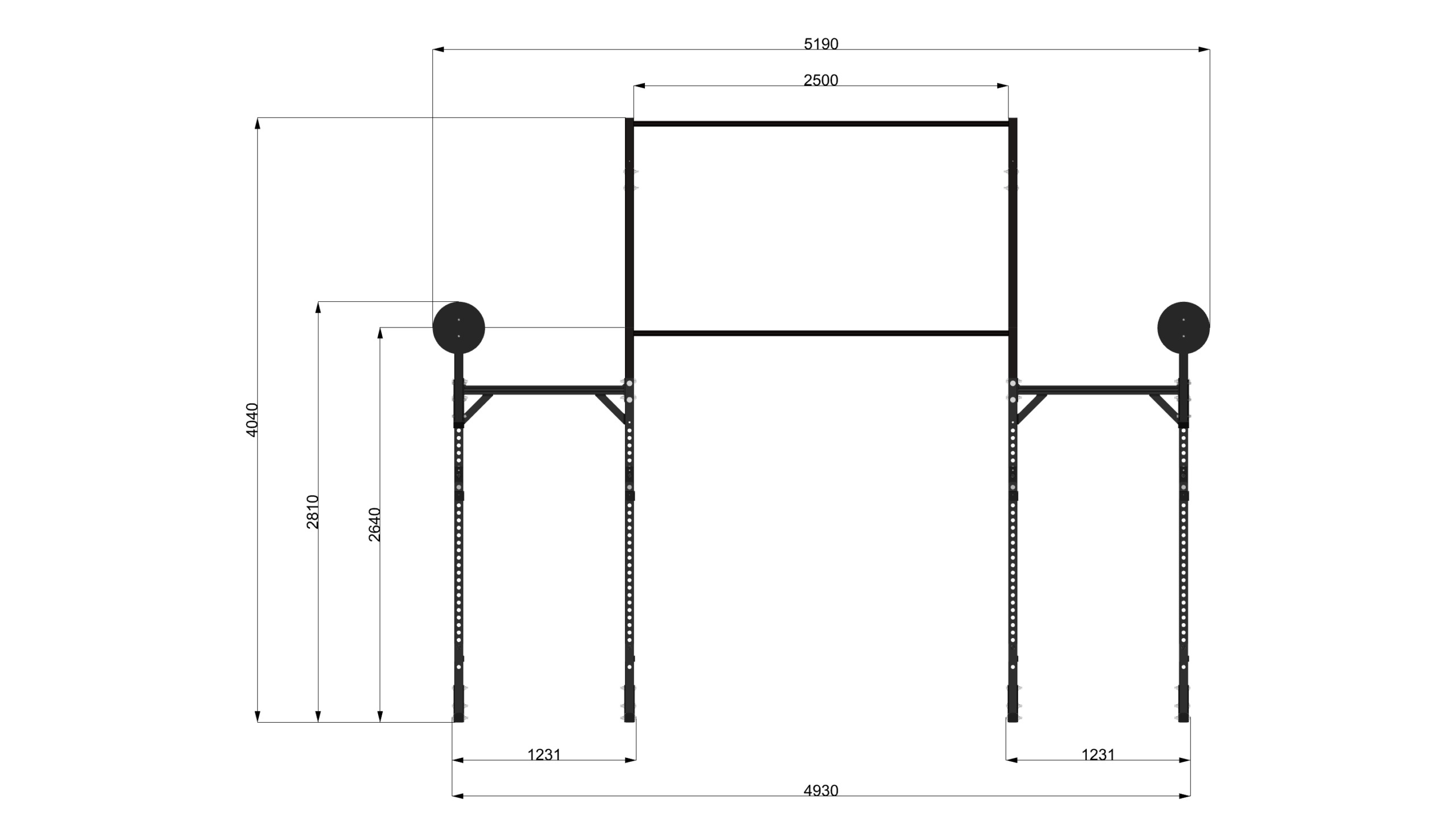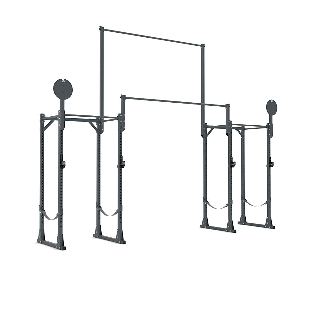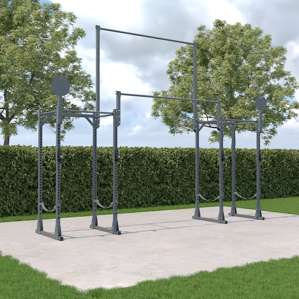 As it includes two racks, this model allows you to have two stations suitable for barbell training and pull-ups, connected by two raised bars of different heights (2,6 m and 4 m), which can also be used as a support for accessories such as gymnastic rings or climbing ropes. This makes it a professional Rack Station, able to combine Calisthenics Training with functional training, in suspension and with the barbell.
