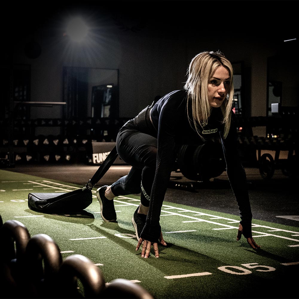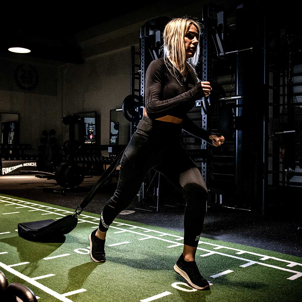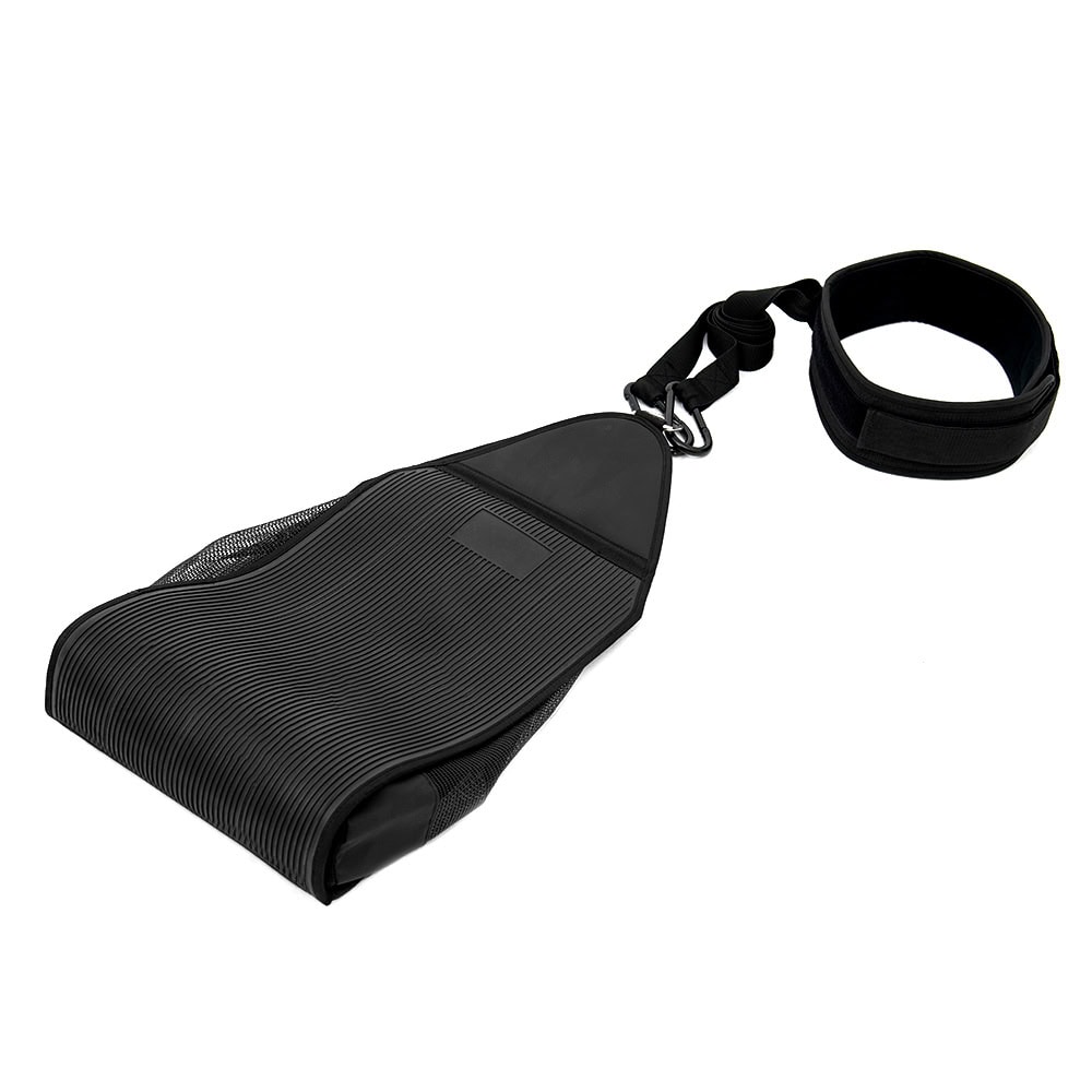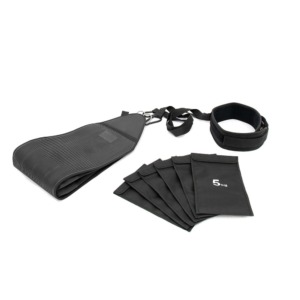 Robust rubber bag with a belt, contains sandbags for sled exercises. Perfect for outdoor use but particularly suitable for indoors, where the floor does not allow metal sleds. The bag type of system allows the athlete to change the weight very quickly. You can decide for yourself how much weight you want to pull. Besides sandbags, it can also be filled with weight plates. This tool is particularly suitable for functional training: drag, crawl exercises, side-steps, and strengthening the lower-body