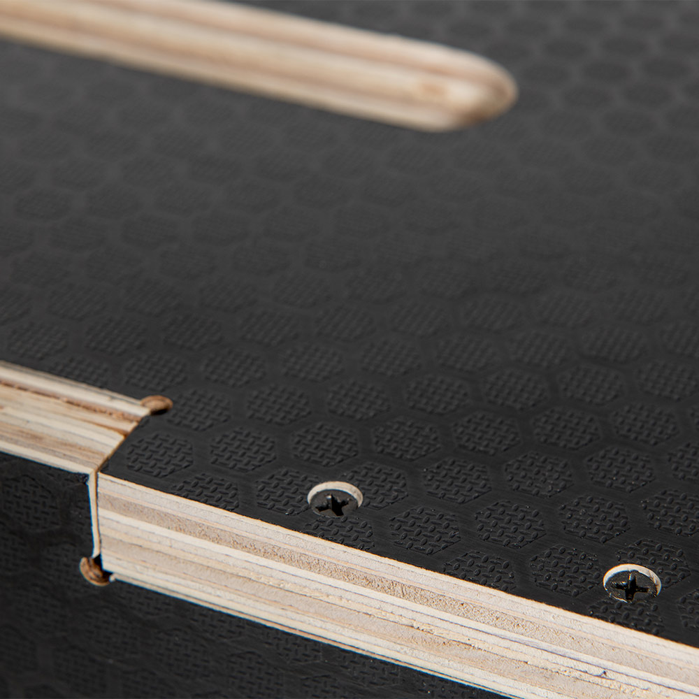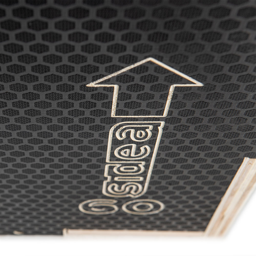 New model made from sturdy multilayer wood panels reinforced through the application of a black waterproof film with hexagonal anti-slip texture.
