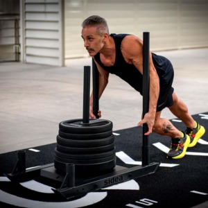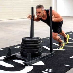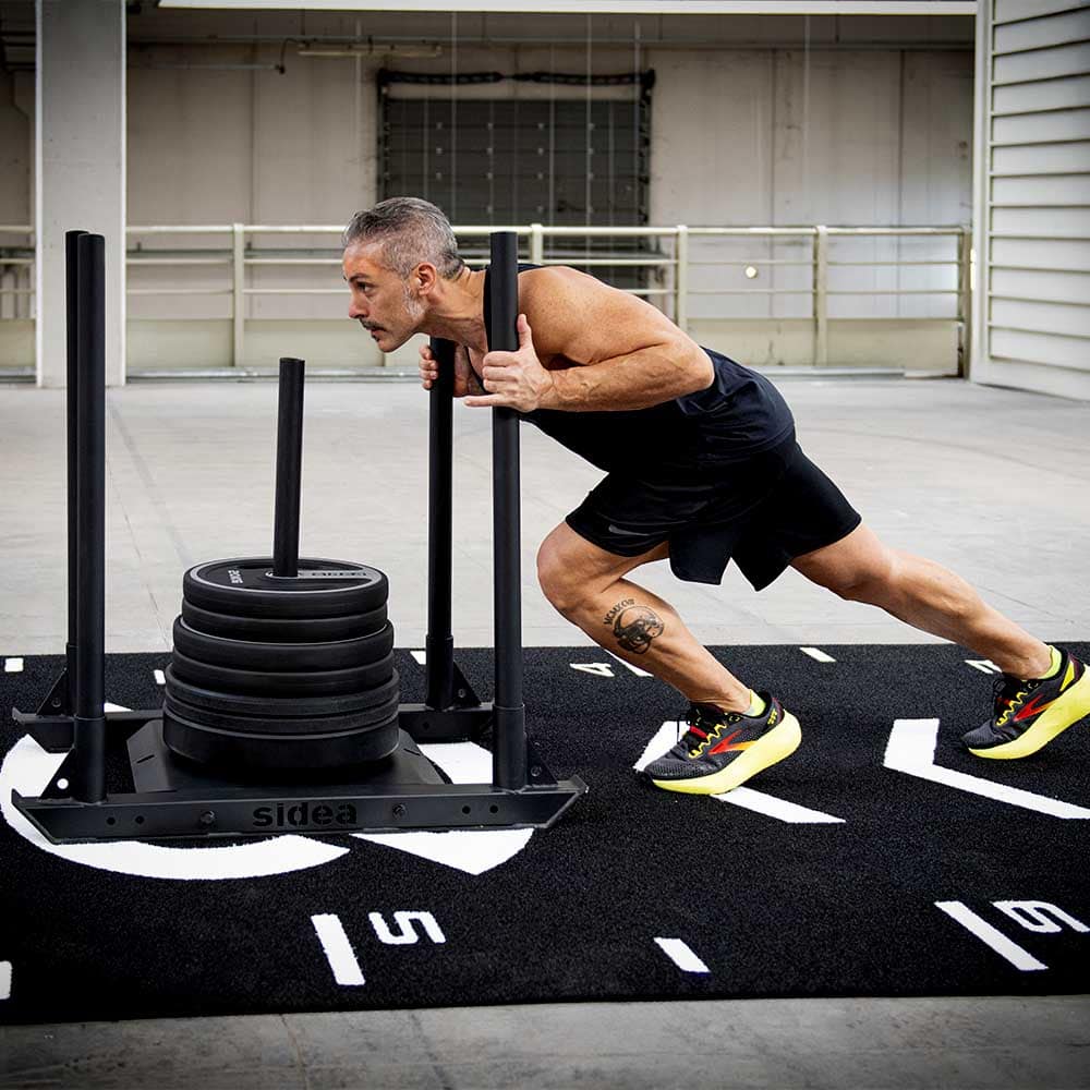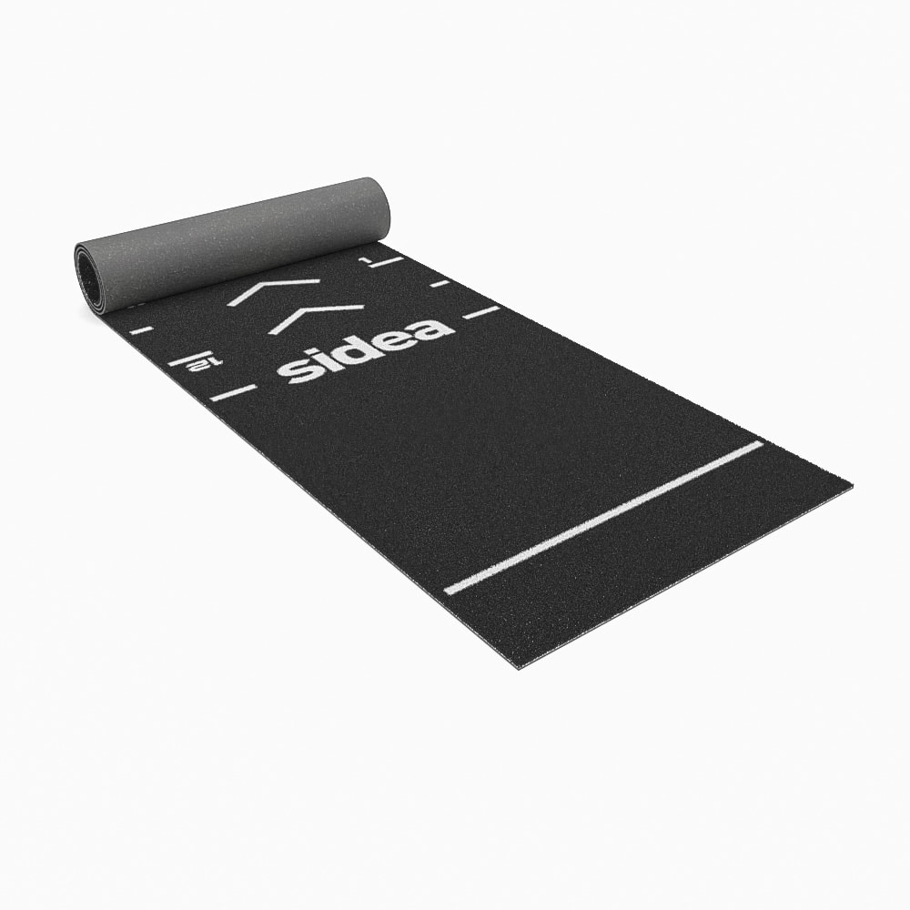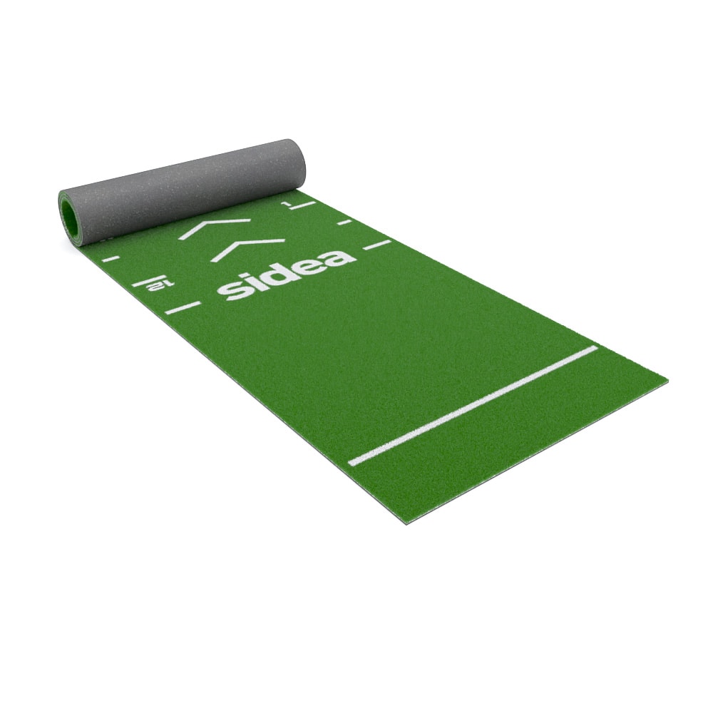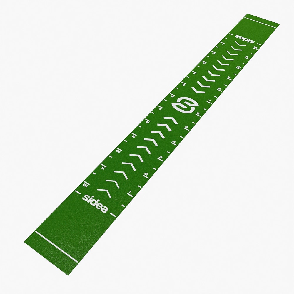 The 9192/RMH EcoGarden Competition Marker synthetic grass track differs from the standard 9192/RM EcoGarden Premium Roll model in length: 17.5 m the Competition, 15 m the standard, and in the type of markers. The Competition model features the two marker lines of 2-meter areas dedicated to the change of direction of the sled in the sled push exercise and the rope pull in the sled pull exercise.
