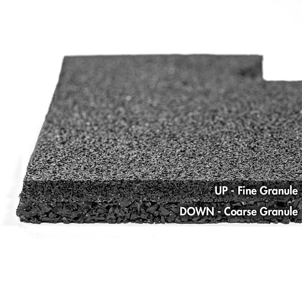 The main feature of the flooring is the production by agglomeration of recycled rubber granules. The ability to absorb shocks, and its affordability, are the elements that define the product. The first quality is guaranteed by the granular composition, the second by the use of recycled rubber. The ability to absorb shocks, however, must be correctly dimensioned if the floor is laid as protection of an existing floor. A few millimeters of rubber cannot wholly absorb every type of impact. The force resulting from the fall of a barbell loaded with dozens of kg is always partly transferred to the floor underneath.