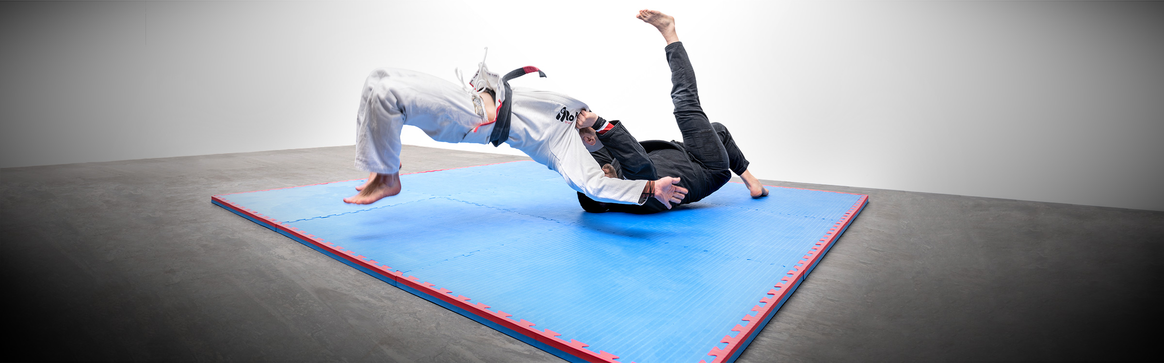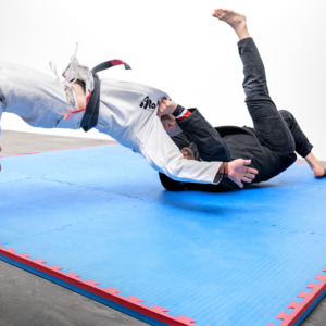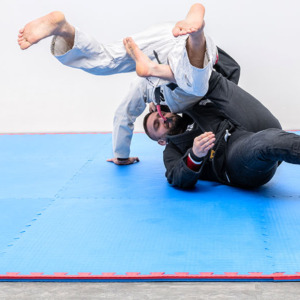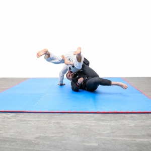 EVA Tatami flooring, with puzzle interlocking, 4 cm thickness and blue-red color. This flooring is particularly used for martial arts and sports activities in general where it is necessary to have a surface with high absorption capacity and an improved degree of support, stability, and adherence. The optimal proportion between absorption and stability is determined by the extraordinary mechanical characteristics of EVA: more “rubbery” and resistant than other polymers. The adherence is guaranteed by a non-abrasive rice straw embossed surface, suitable for ground training such as Primitive Functional Movements.