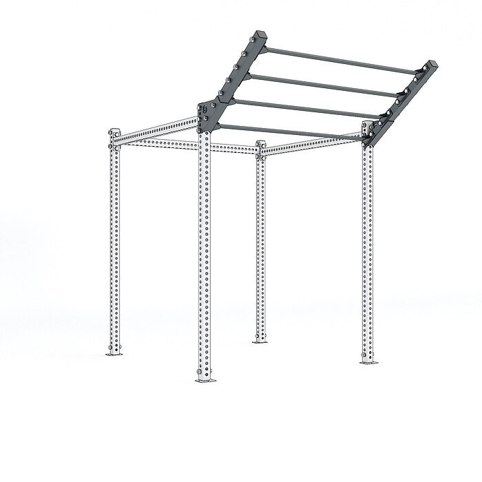 This solution provides an excellent balance between the overall space of the structure and the presence of a “high” bar for pull-ups, attaching resistance bands, such as the Power Loop cod. 0513-0518, suspension training equipment, like the Flying cod. 2092, or rings, like the Ring cod. 2088, 2088/1, 2089.