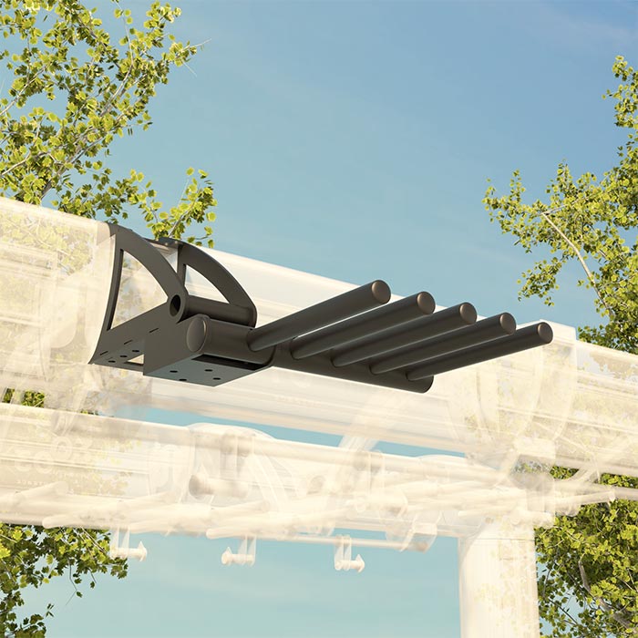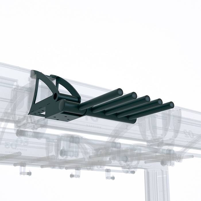 Sky storage is a structural module composed of 5 bars designed as a companion storage option of the suspension apps (Connectors, Flying, Trapezex Straps, Training Ladder, Suspension Core, Fitness Hammock) . The prong separation on the rack has been explicitly designed for the pinch points of the rope handles.