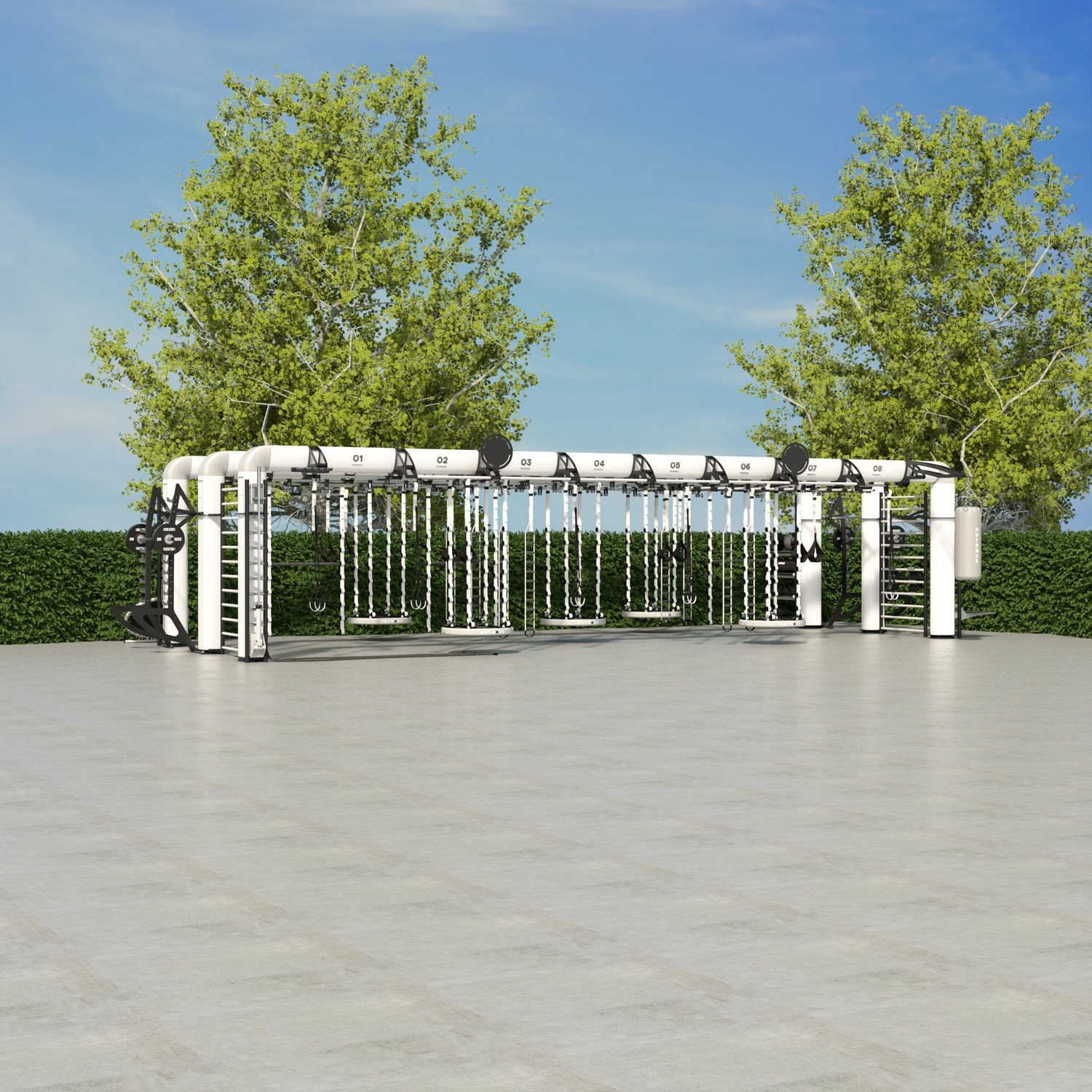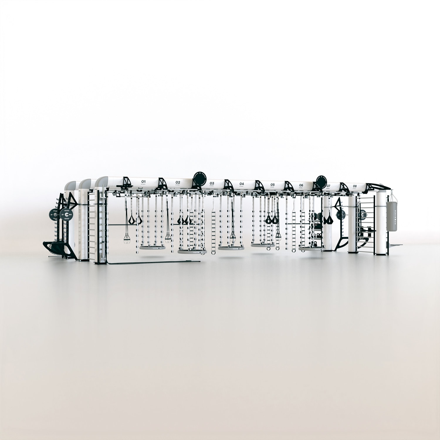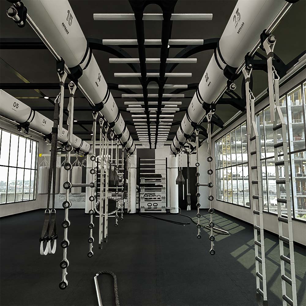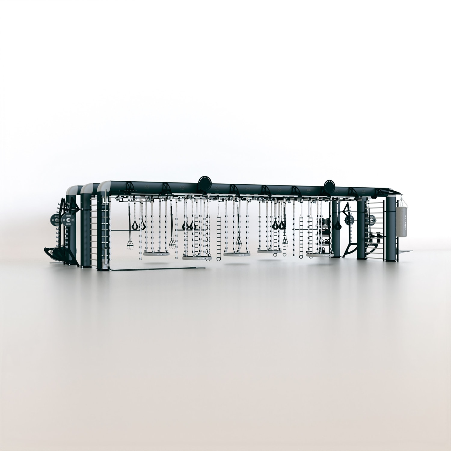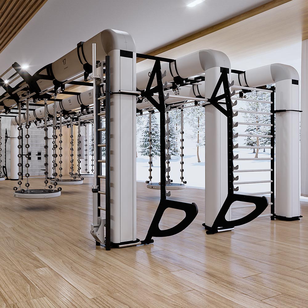 OUTRACE R3-12 is a standard configuration of the OUTRACE range, characterized by the presence of three beams (each 12 m in length), able to host over 32 users at the same time. Thanks to its size, this structure is perfect for group training classes or circuits developed on different stations, taking advantage of the large work space generated both below the structure and around it. The wide range of components and accessories enables it to be equipped for all types of training applications, from functional to suspension training, from barbell training to calisthenics and combat sports.