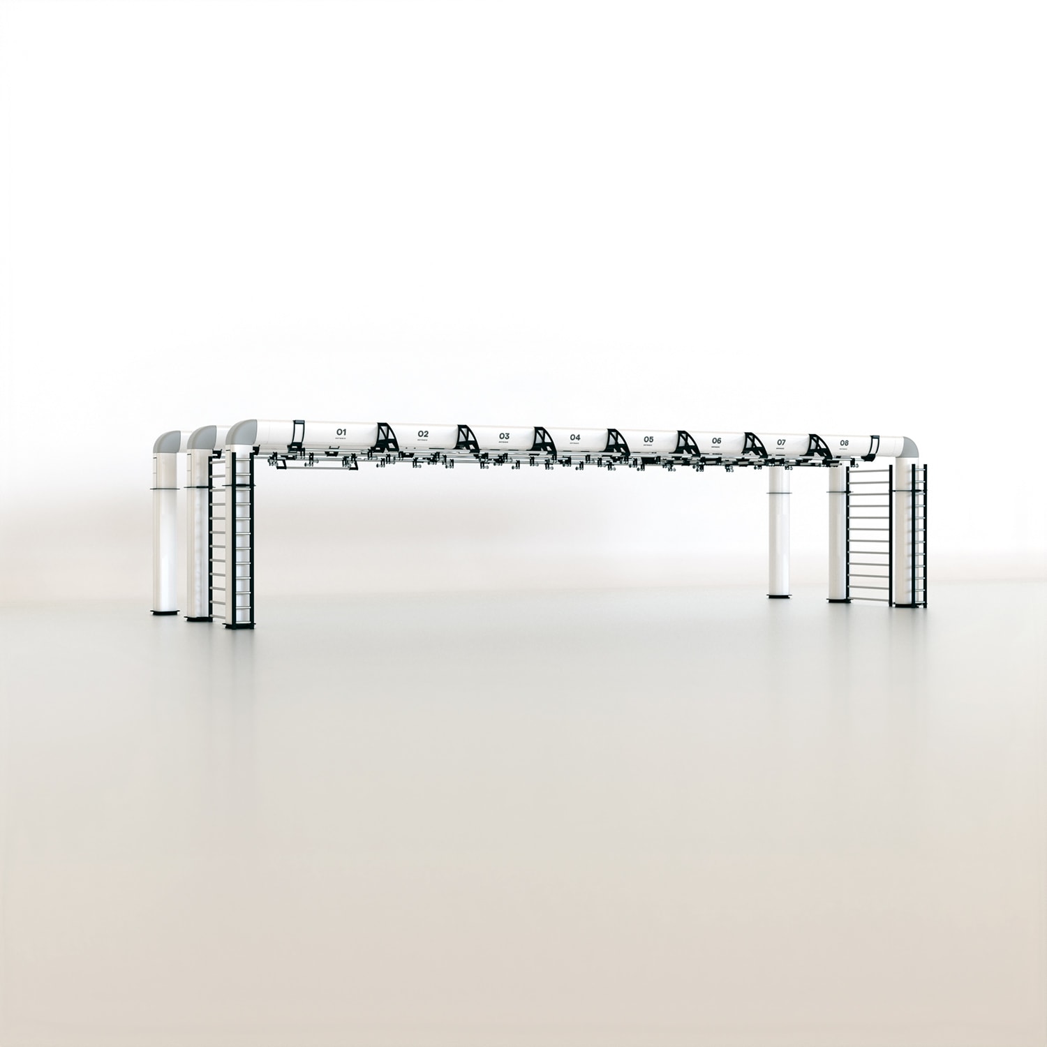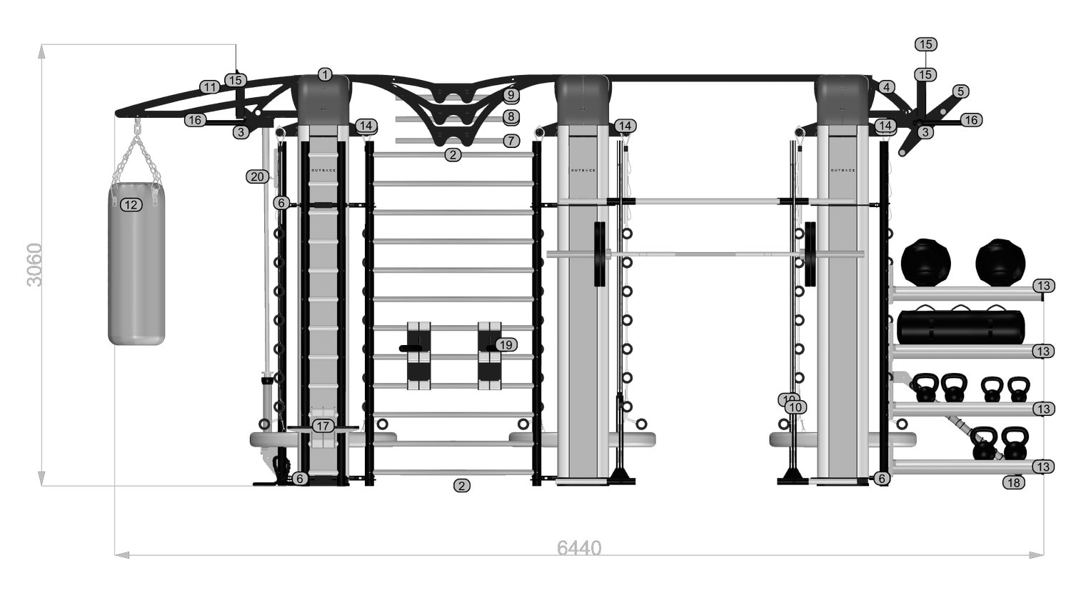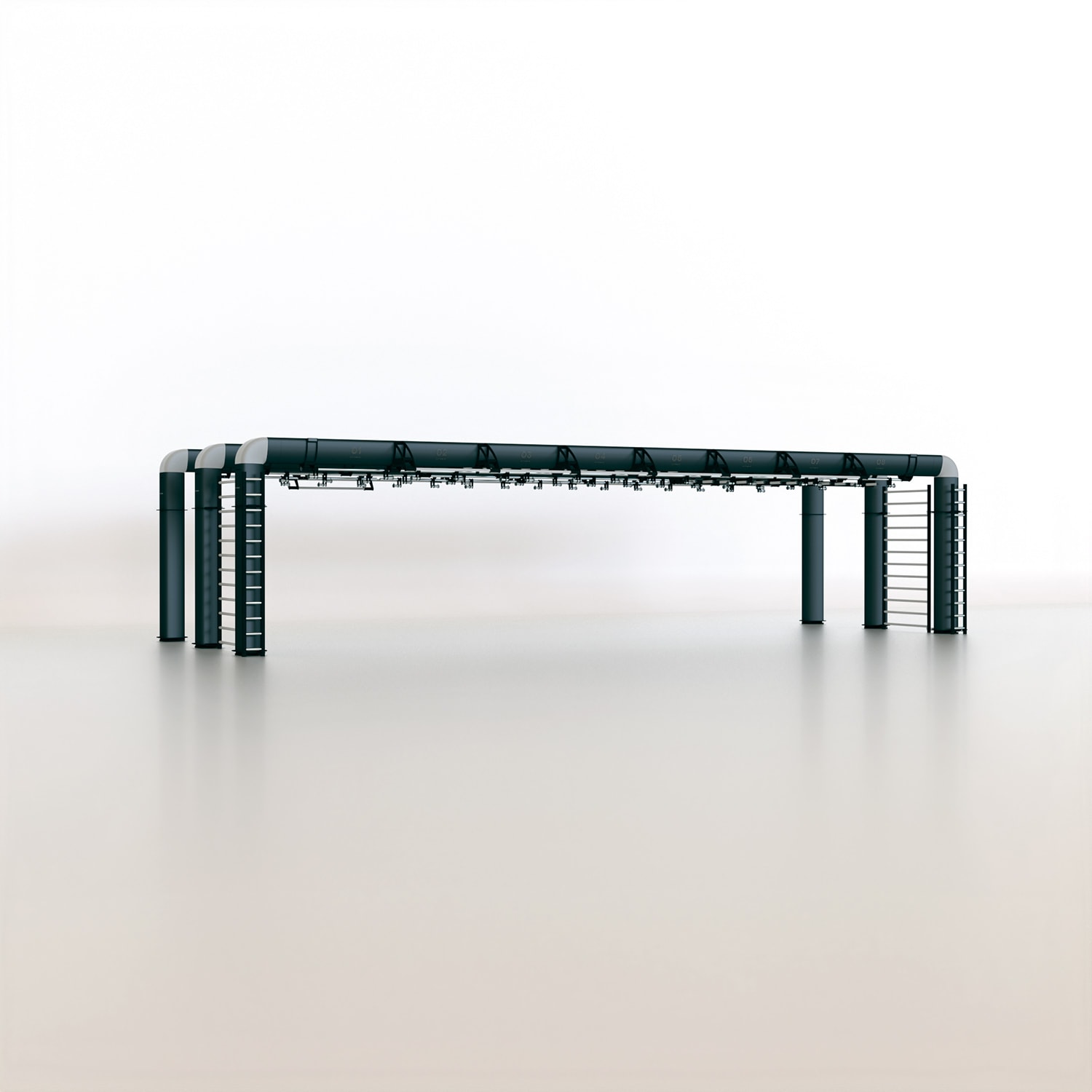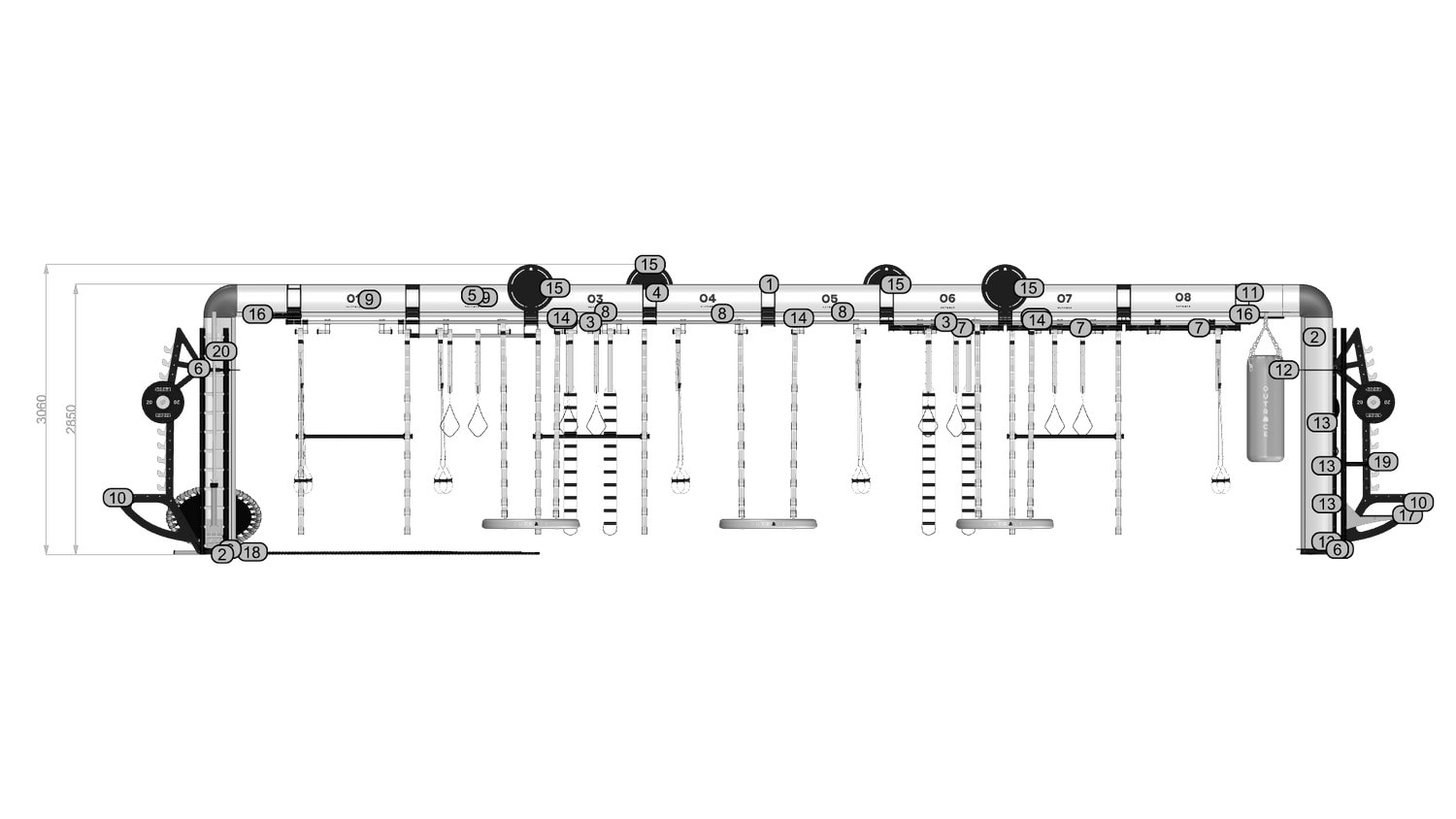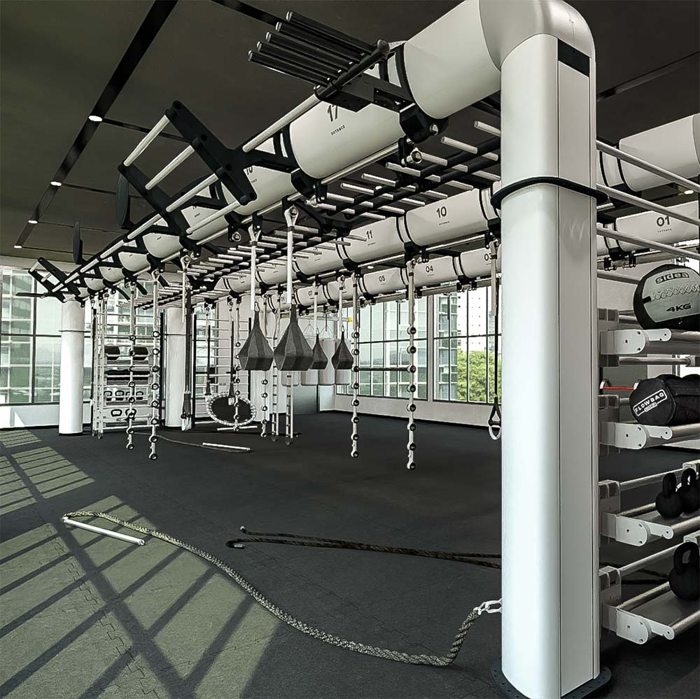 OUTRACE R3-12 is a standard configuration of the OUTRACE range, characterized by the presence of three beams (each 12 m in length), able to host over 32 users at the same time. Thanks to its size, this structure is perfect for group training classes or circuits developed on different stations, taking advantage of the large work space generated both below the structure and around it. The wide range of components and accessories enables it to be equipped for all types of training applications, from functional to suspension training, from barbell training to calisthenics and combat sports.